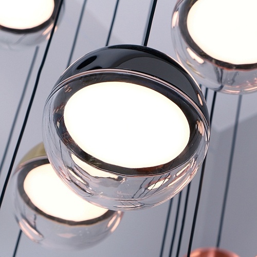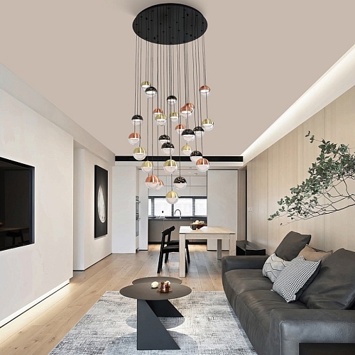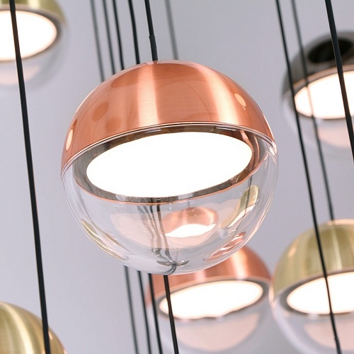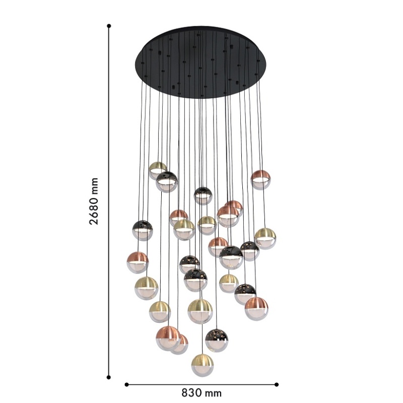 Каскадная люстра с черным каркасом, с шарообразными плафонами трех цветов (черный глянцевый, золото, розовое золото), разделенными на две части — металлическую и акриловую, в центре плафона расположен LED-модуль, создающий оригинальный световой эффект, регулируемая высота.