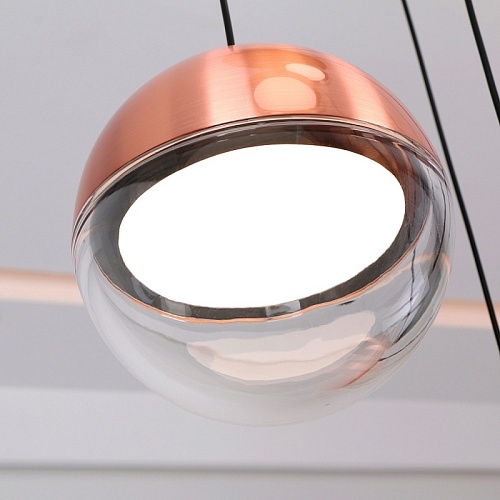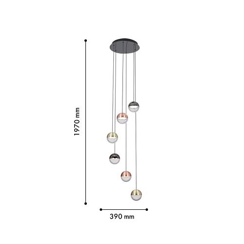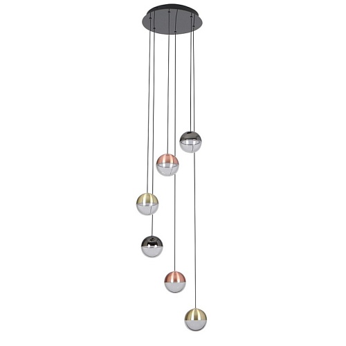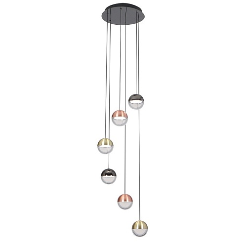 Каскадная люстра с черным каркасом, с шарообразными плафонами трех цветов (черный глянцевый, золото, розовое золото), разделенными на две части — металлическую и акриловую, в центре плафона расположен LED-модуль, создающий оригинальный световой эффект, регулируемая высота.