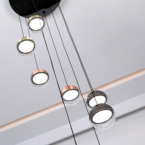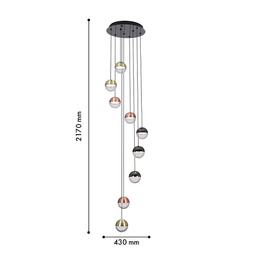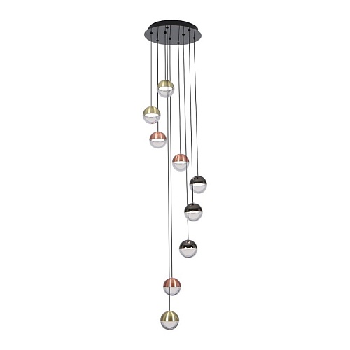Каскадная люстра с черным каркасом, с шарообразными плафонами трех цветов (черный глянцевый, золото, розовое золото), разделенными на две части — металлическую и акриловую, в центре плафона расположен LED-модуль, создающий оригинальный световой эффект, регулируемая высота.