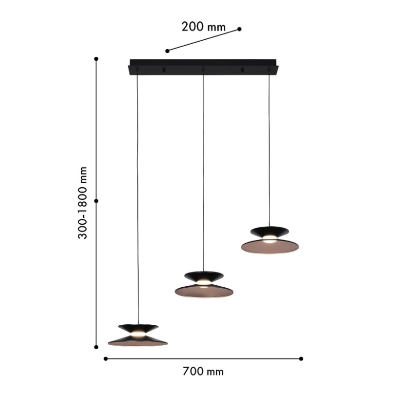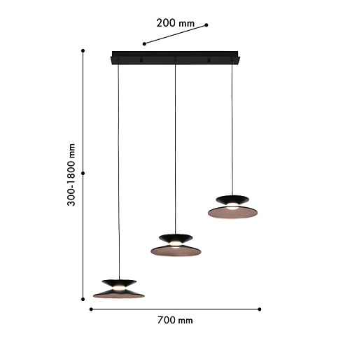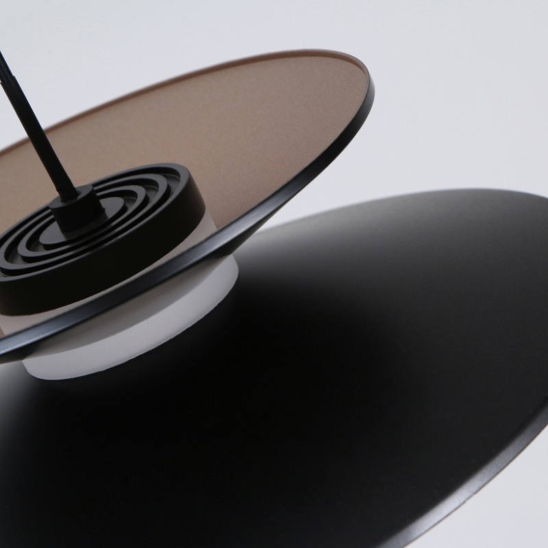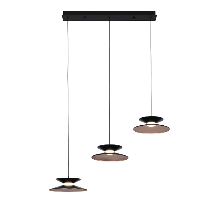 Потолочная люстра, плафоны в виде соединённых между собой конусов, свет от расположенного внутри модуля LED направлен вниз и так же проходит между конусами, черный матовый корпус, регулируемая высота.