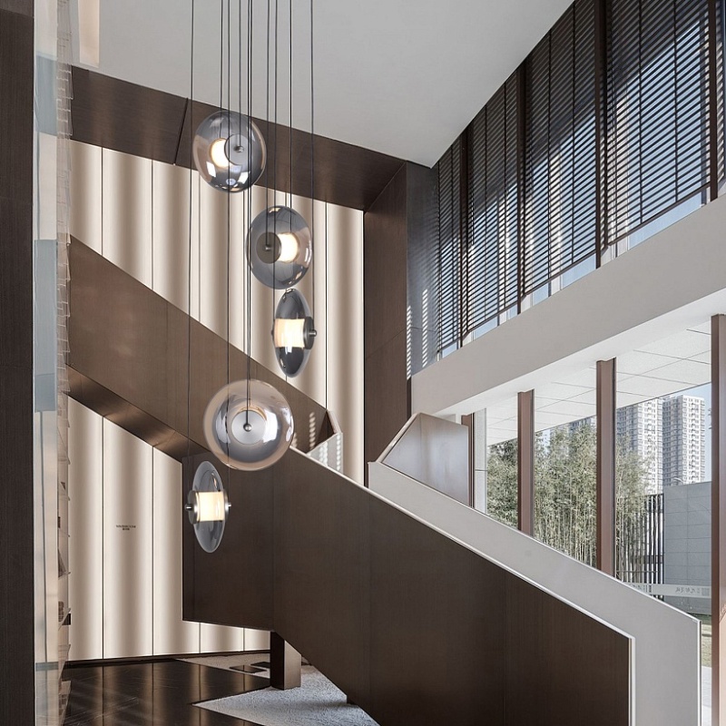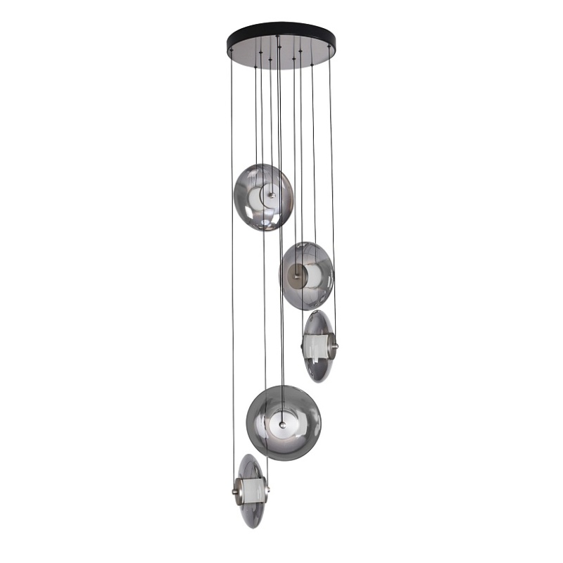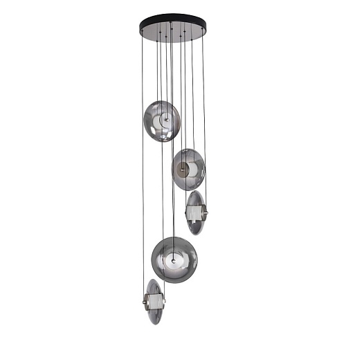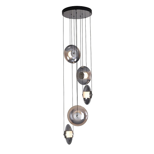 Металлический каркас черного матового цвета, вертикальное крепление плоского сферического выдувного плафона из дымчато-серого стекла, по периметру сердцевины плафона расположен модуль LED.