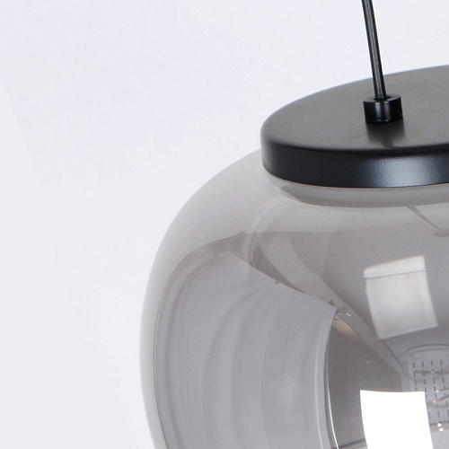 Потолочная люстра с черным каркасом и декором в цвете никель, плафоны из выдувного стекла дымчато-серого цвета, встроенный модуль LED, регулируемая высота.