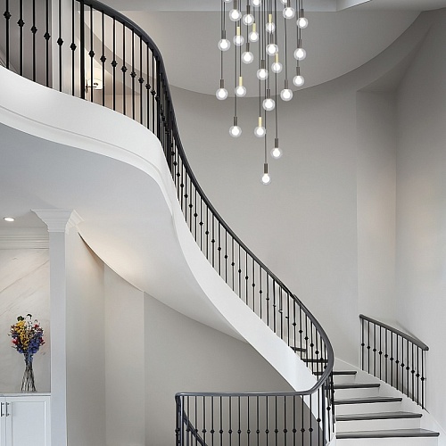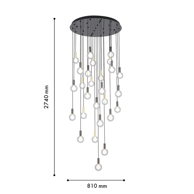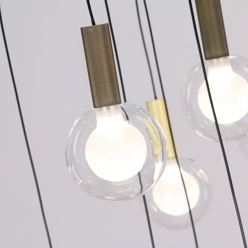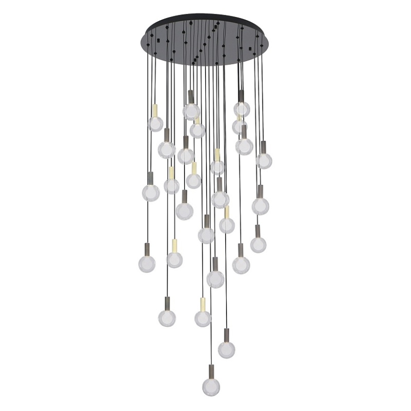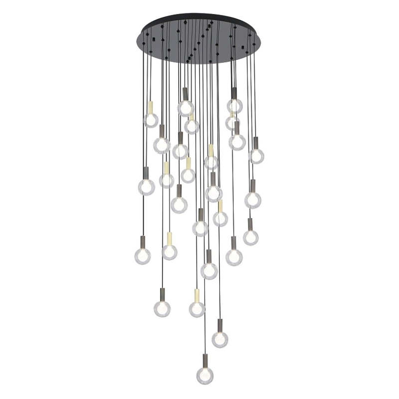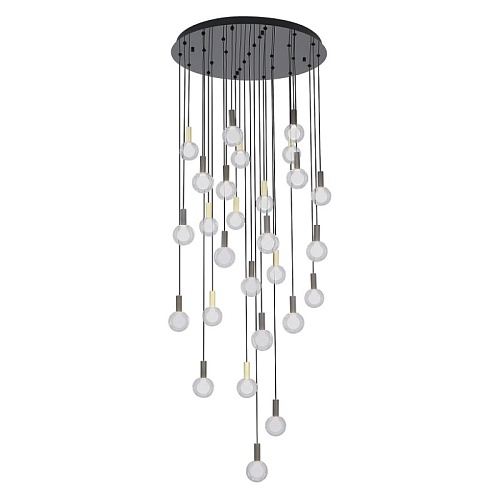Подвесная каскадная люстра с черным каркасом, подвесы в трех цветах - матовый черный, матовое золото и античная бронза, плафоны из двойного стекла — прозрачного снаружи и матового внутри, декоративные цоколи в форме металлических цилиндров с рифленым решетчатым узором, LED-модули.