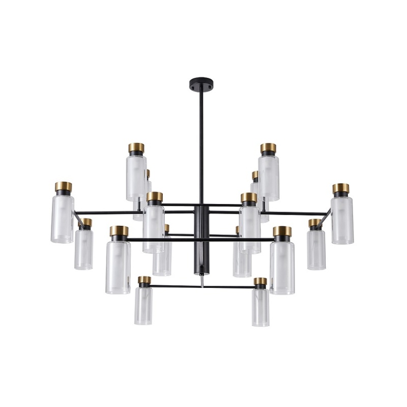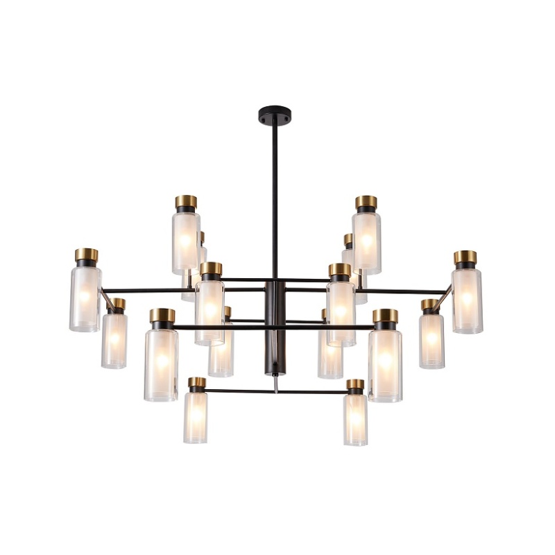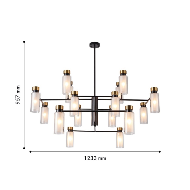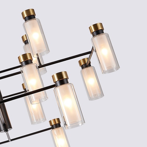 Металлический каркас черного матового цвета, цилиндрические плафоны, состоящие из двух слоев: внутренний из белого матового стекла, внешний - из прозрачного стекла, декоративные элементы в цвете латунь, цоколь E14.