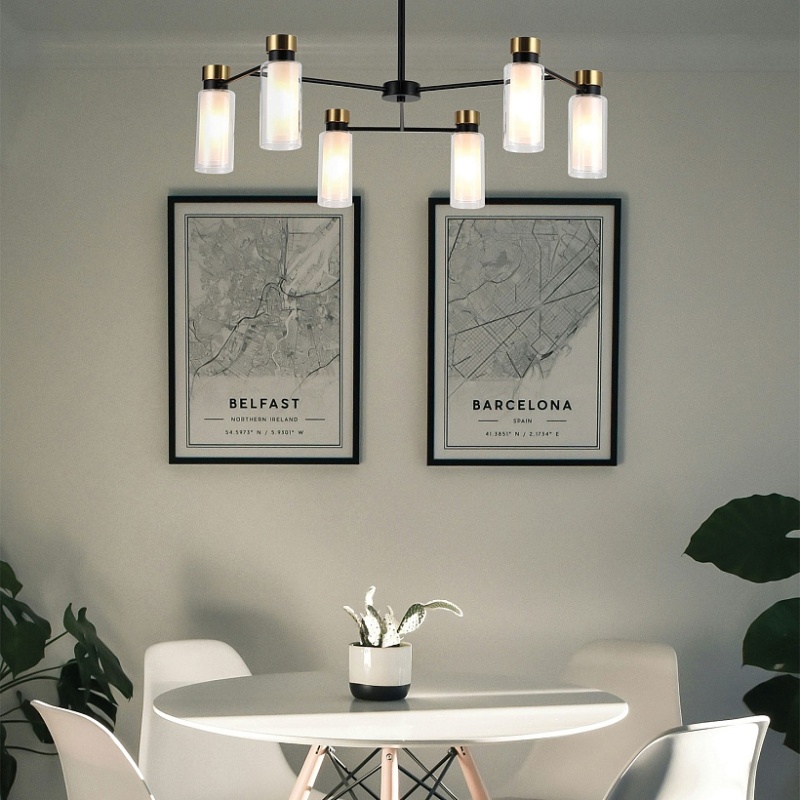 Металлический каркас черного матового цвета, цилиндрические плафоны, состоящие из двух слоев: внутренний из белого матового стекла, внешний - из прозрачного стекла, декоративные элементы в цвете латунь, цоколь E14.