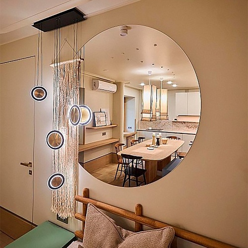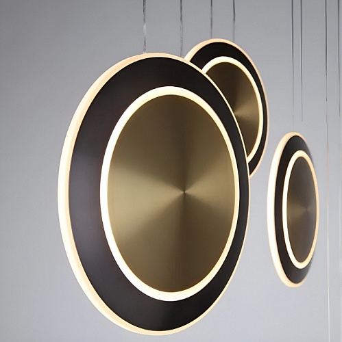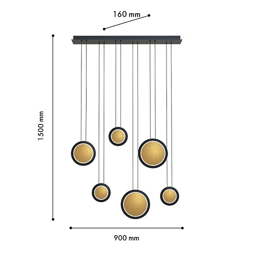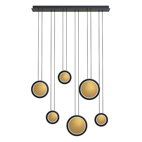 Потолочная люстра с каркасом в черном цвете, с 6 плафонами в форме дисков различных размеров в цвете латуни с черным кантом. Каждый диск оснащен тремя встроенными лентами LED, подвешен на двух параллельных струнах и имеет регулируемую высоту.