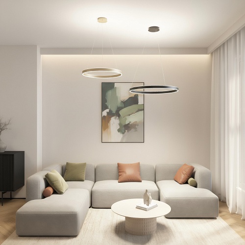 RAYDIA — коллекция подвесных светильников с уникальным кольцевым дизайном, создающих мягкое равномерное освещение в двух направлениях: вверх и вниз. Элегантный дизайн делает их стильным акцентом в любом пространстве. Металлический корпус с акриловым рассеивателем. CRI ? 80 для естественного восприятия оттенков. Регулировка цветовой температуры 3000К–4000К. Угол рассеивания 120° для комфортного общего света. Доступны два размера: 600 и 800 мм. Цветовые решения: черный и матовое золото. Идеально для гостиных, обеденных зон, переговорных и общественных пространств. Коллекция сочетает в себе функциональность и декоративность, создавая гармоничное освещение и подчёркивая архитектурные особенности интерьера. Срок гарантии 3 года.