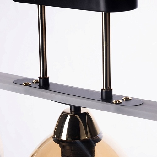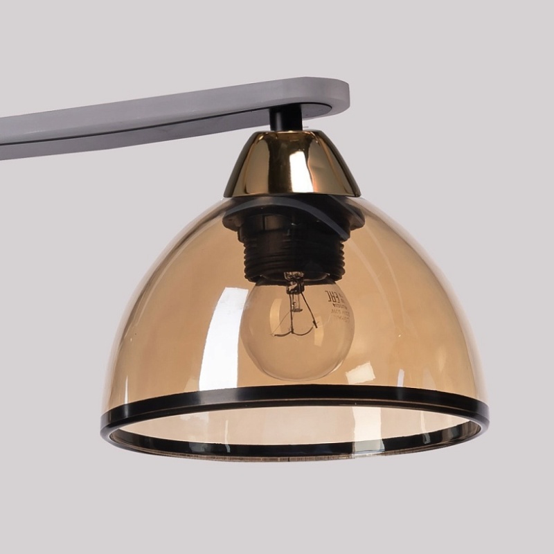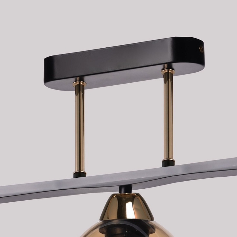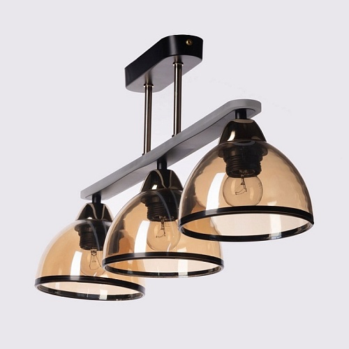 Металлическое основание потолочной люстры окрашено в черный цвет. Отдельные элементы основания гальванизированы в цвет золота. Потолочная люстра декорирована стеклянными плафонами и матовым акрилом. Плафоны гальванизированы в цвет коньяк и отделаны металлическим кантом черного цвета.