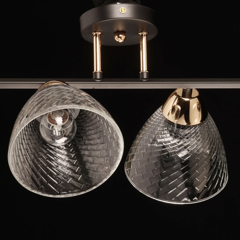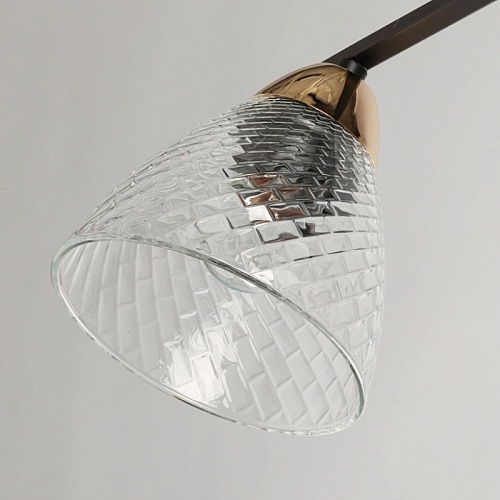 Металлическое основание потолочной люстры окрашено в черный цвет. Отдельные элементы основания гальванизированы в цвет золота. Потолочный светильник декорирован плафонами из прозрачного фактурного стекла.
