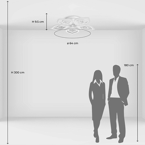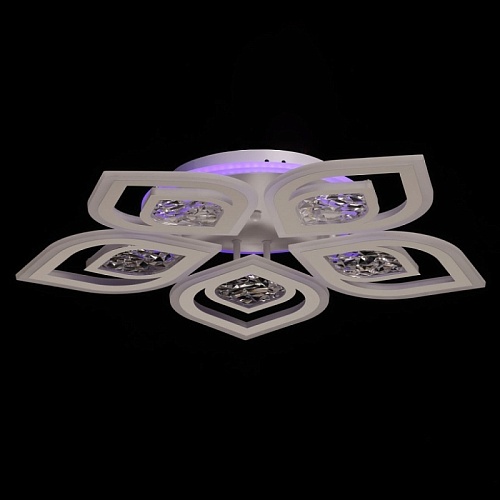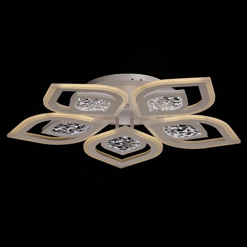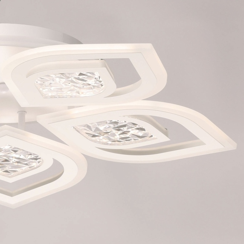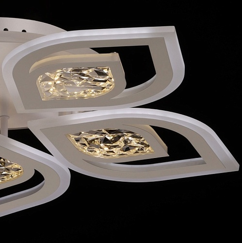 Металлическое основание потолочной люстры окрашено в белый цвет. Корпус плафона выполнен из сплава алюминия с цинком и окрашен в цвет основания. Светодиодные источники света закрыты белым матовым и прозрачным фактурным акрилом. Светильник приходит в состоянии частичной сборки в компактной упаковке: вся электрика подсоединена, достаточно закрепить плафоны на корпусе.