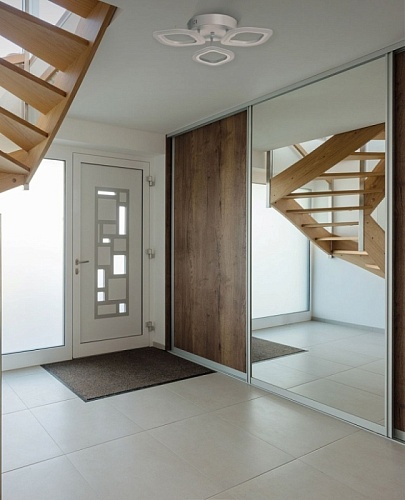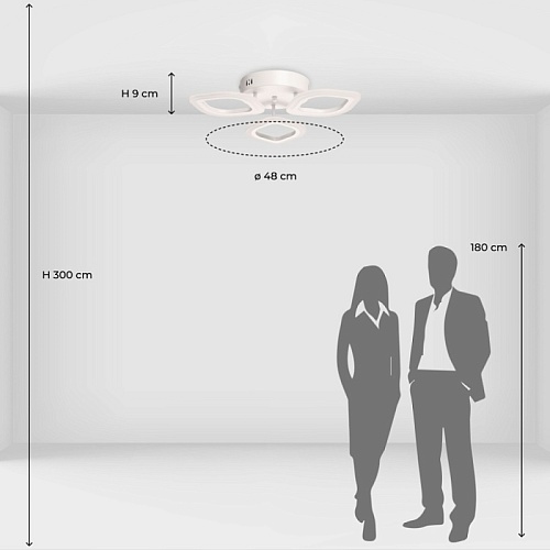 Металлическое основание потолочной люстры окрашено в белый цвет. Корпус плафона выполнен из сплава алюминия с цинком и окрашен в цвет основания. Светодиодные источники света закрыты белым матовым акрилом. Светильник приходит в состоянии частичной сборки в компактной упаковке: вся электрика подсоединена, достаточно закрепить плафоны на корпусе.