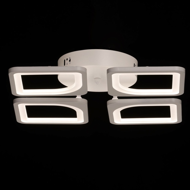 Металлическое основание потолочной люстры окрашено в белый цвет. Корпус плафона выполнен из сплава алюминия с цинком и окрашен в цвет основания. Светодиодные источники света закрыты белым матовым акрилом. Светильник приходит в состоянии частичной сборки в компактной упаковке: вся электрика подсоединена, достаточно закрепить плафоны на корпусе.
