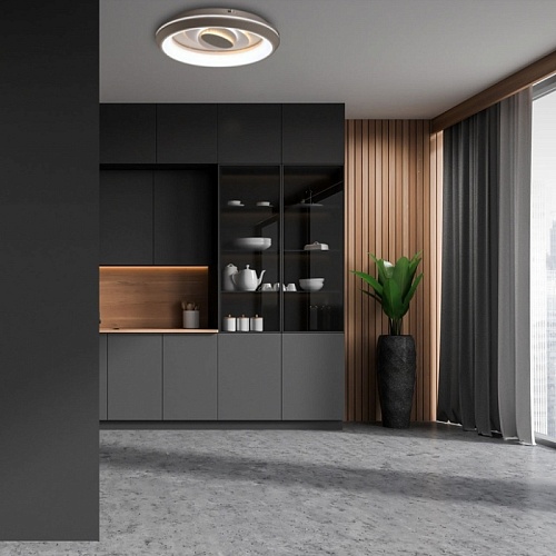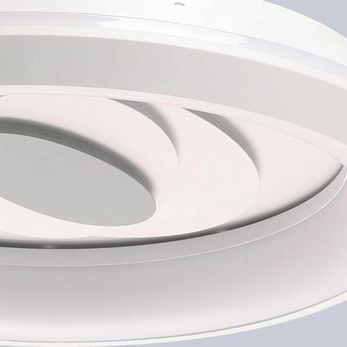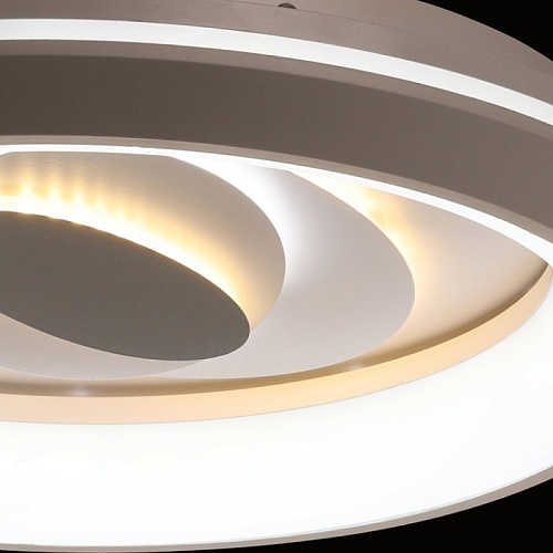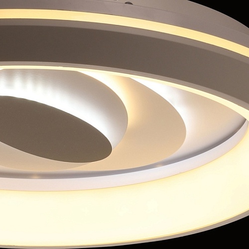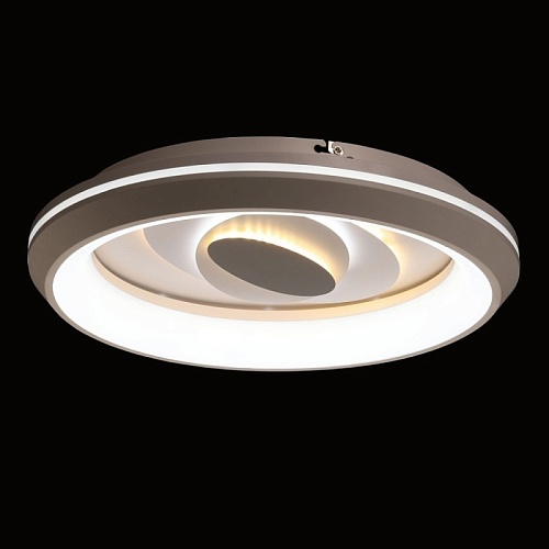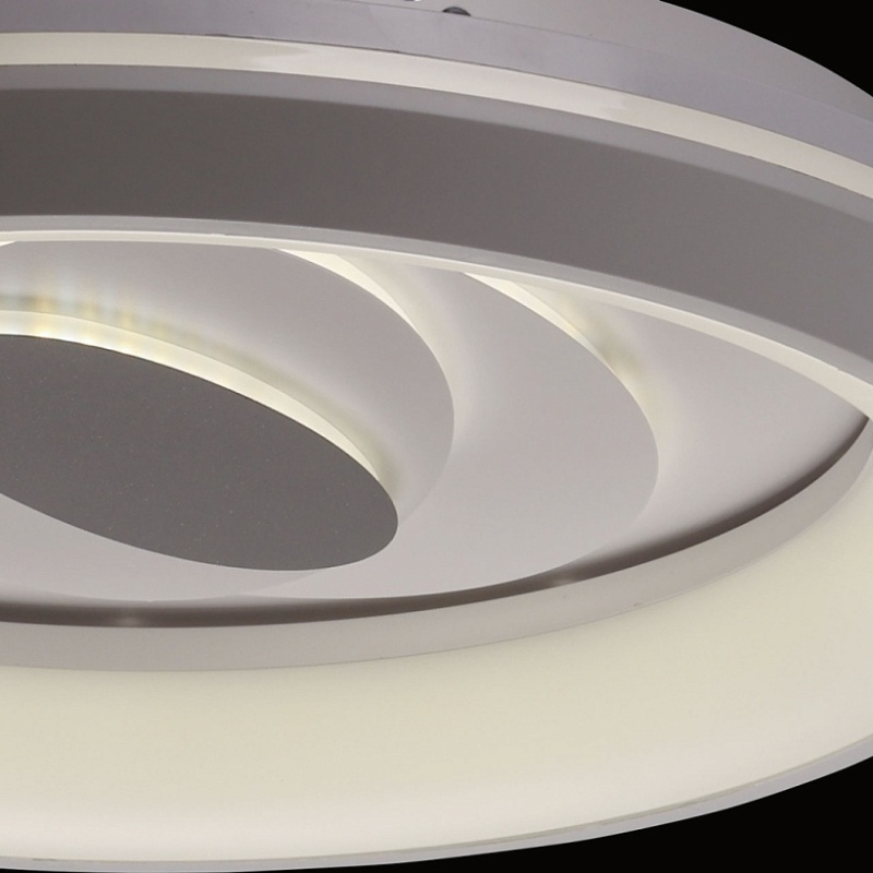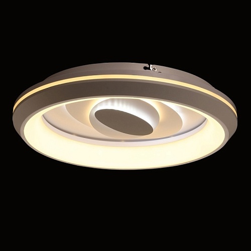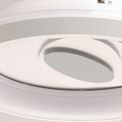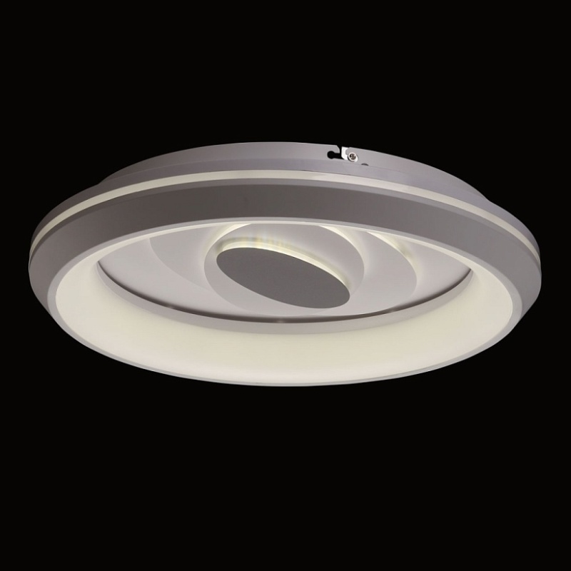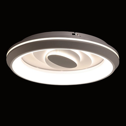 Металлическое основание потолочной люстры окрашено в белый цвет. Декоративный металлический элемент в центре окрашен в серый цвет. Светодиодные источники света закрыты белым матовым акрилом.