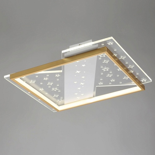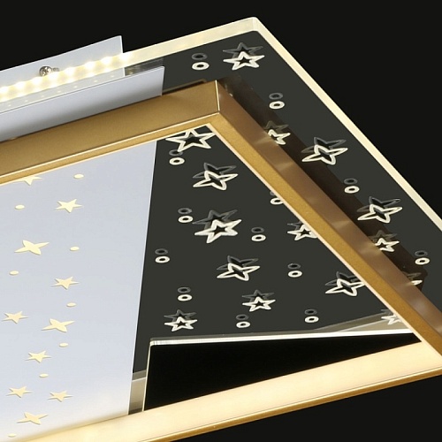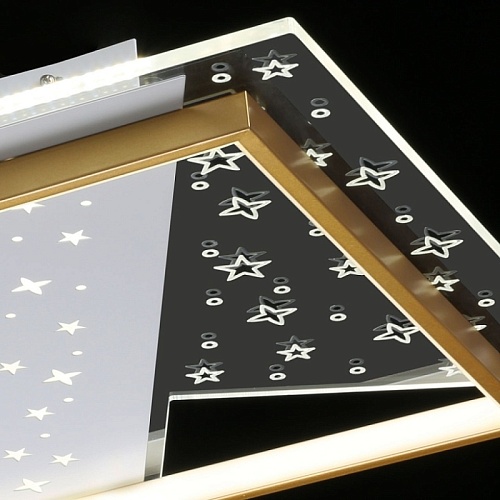 Металлическое основание и плафоны потолочной люстры окрашены в белый цвет и в цвет золота. Светильник декорирован прозрачным акрилом с рисунком звёздного неба.Светодиодные источники света закрыты белым силиконом и матовым акрилом.
