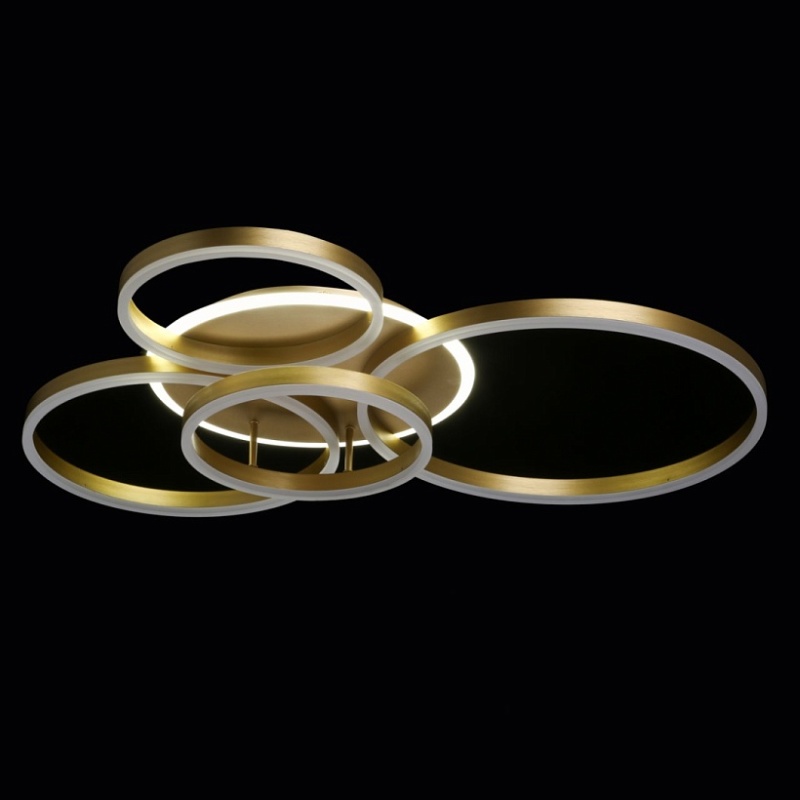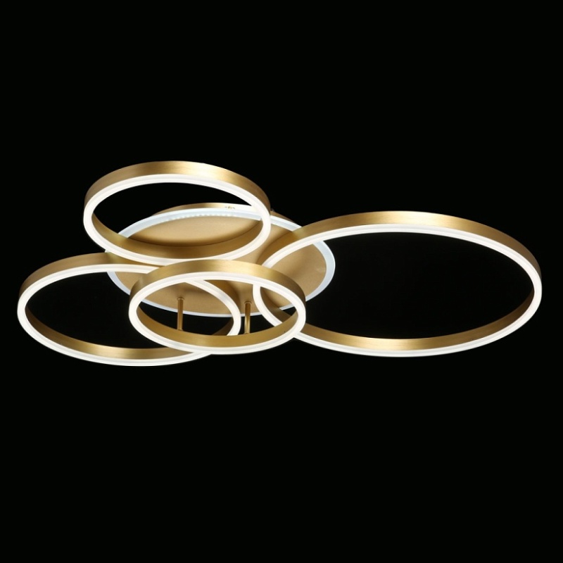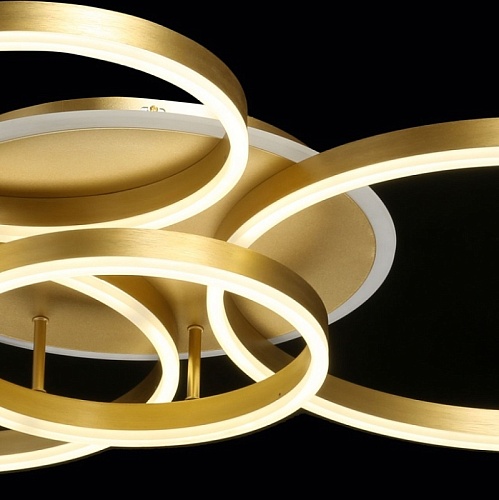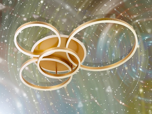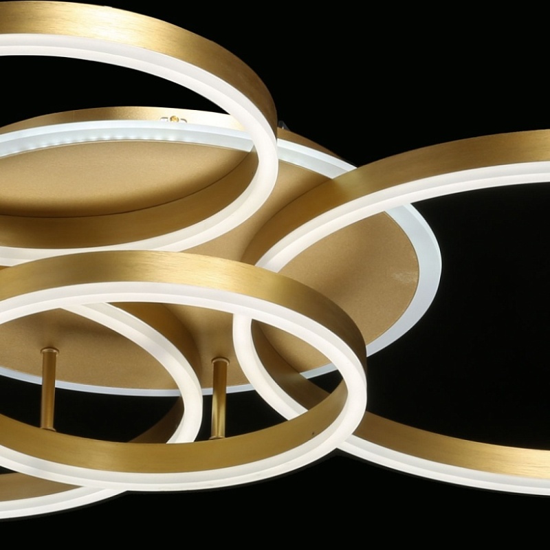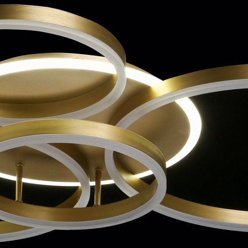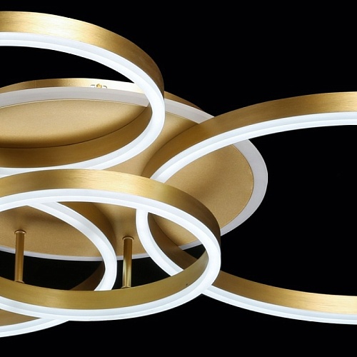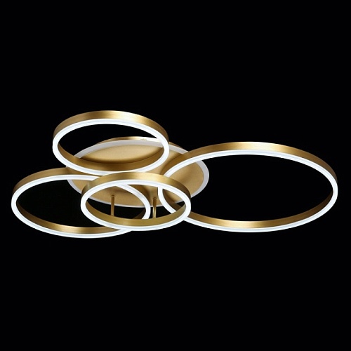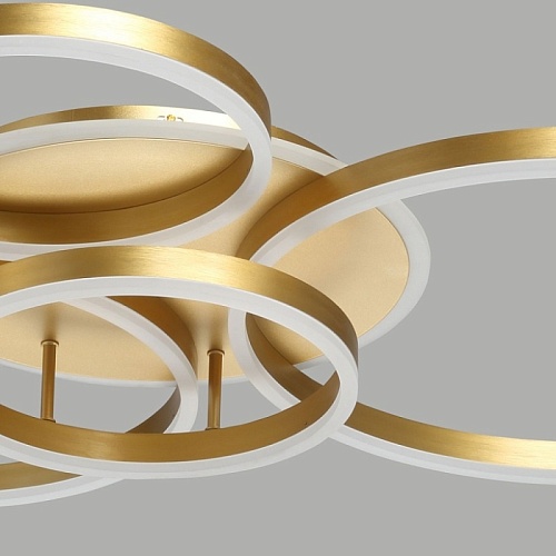 Металлическое основание потолочной люстры окрашено в цвет золота. Плафоны выполнены из сплава алюминия с цинком, обработаны по технологии брашинг и окрашены в цвет основания. Светодиодные источники света закрыты матовым акрилом.
