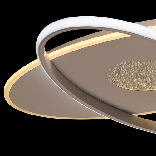 Металлическое основание потолочной люстры окрашено в белый цвет. Светодиодные источники света на основании закрыты матовым акрилом, на плафоне - силиконом белого цвета.