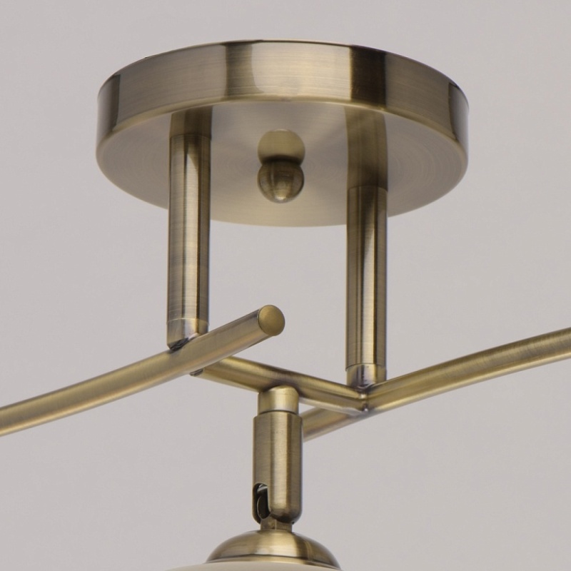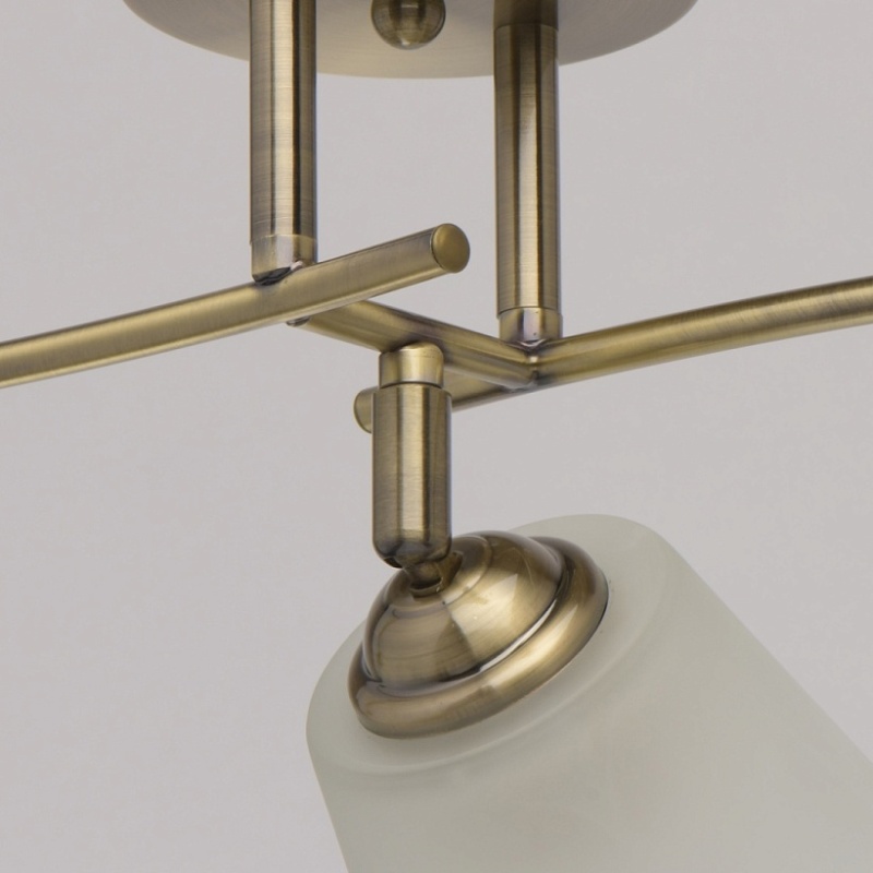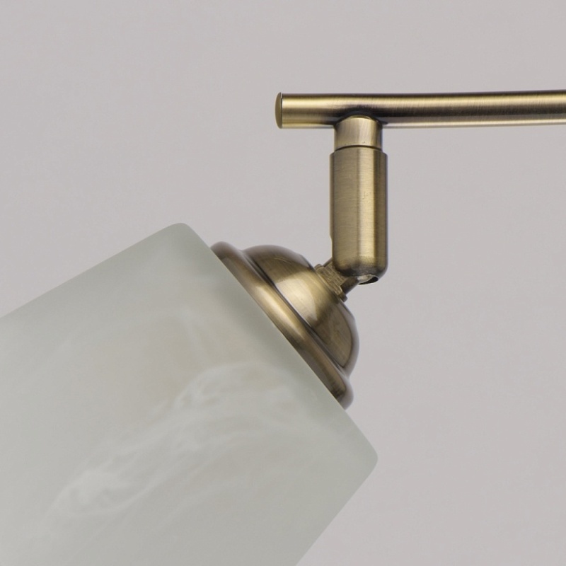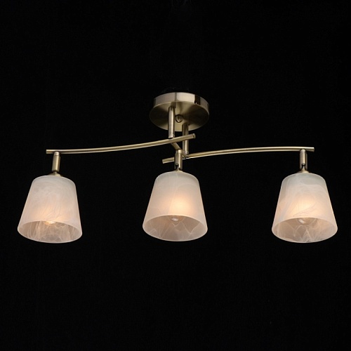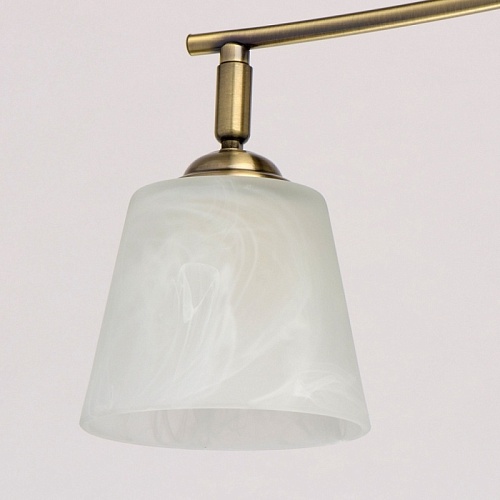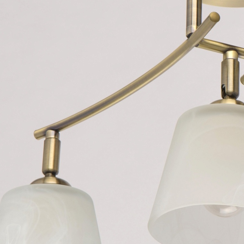Основание светильника выполнено из металла и гальванизировано в цвет бронзы с последующим патинированием. Плафоны выполнены из алебастрового стекла.