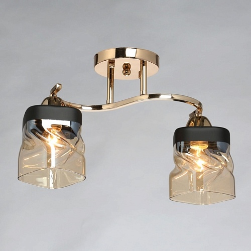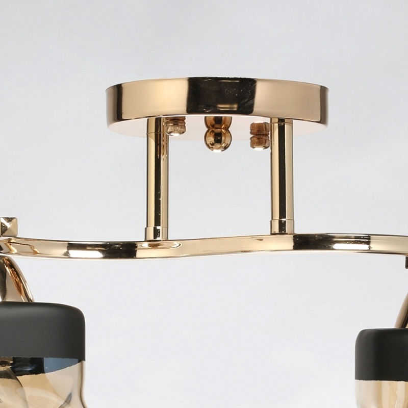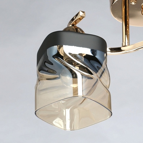 Металлическое основание светильника гальванизировано в цвет золота. Стеклянные плафоны отлиты в сложную перекрученную форму и гальванизированы в коньячный цвет. У основания плафоны окрашены в черный цвет.