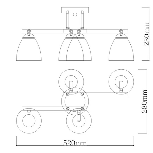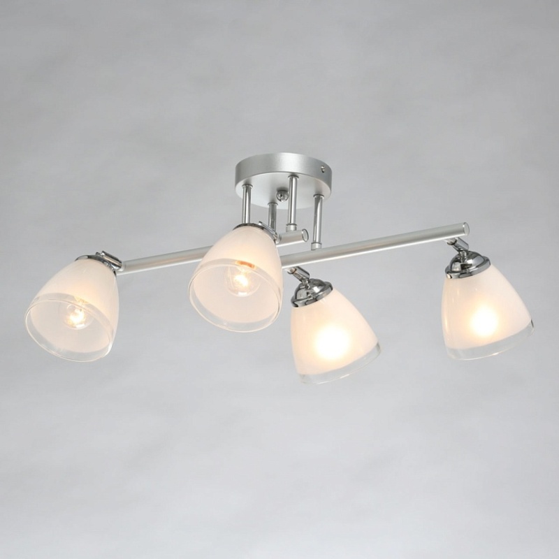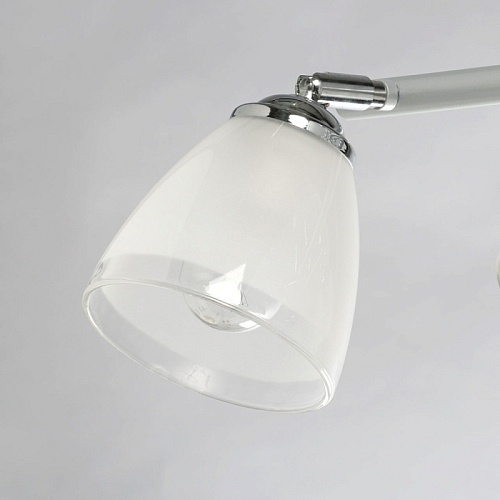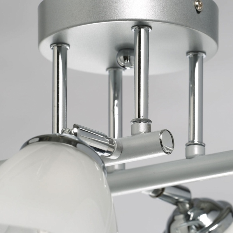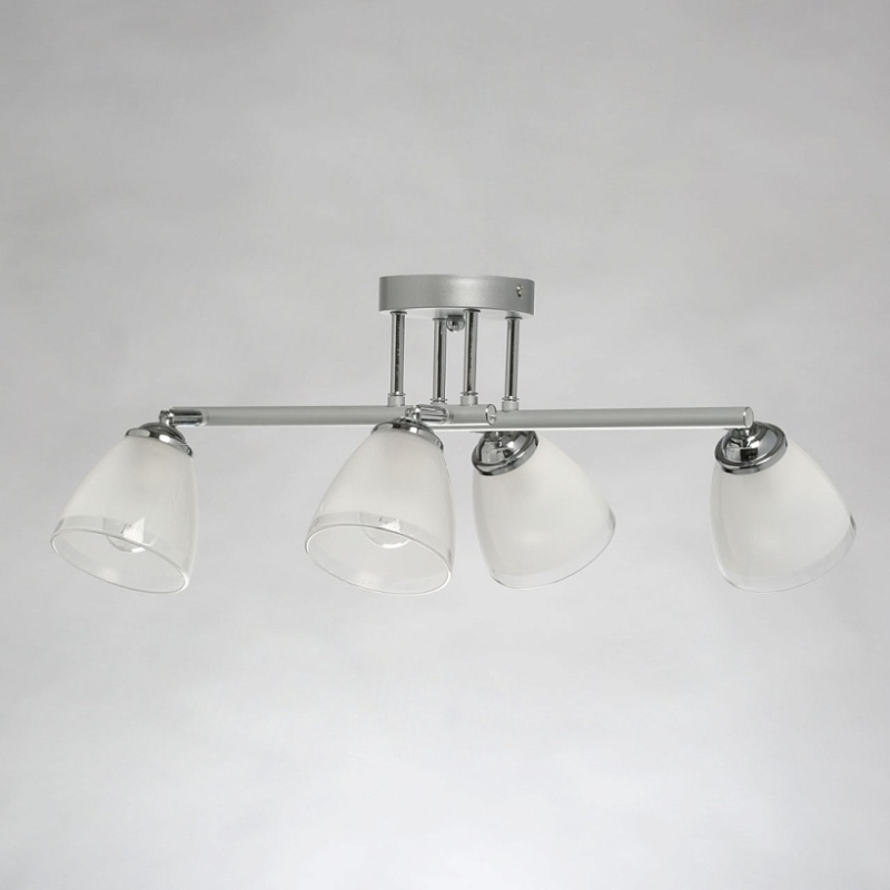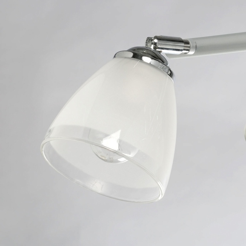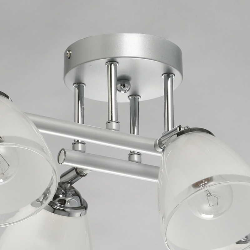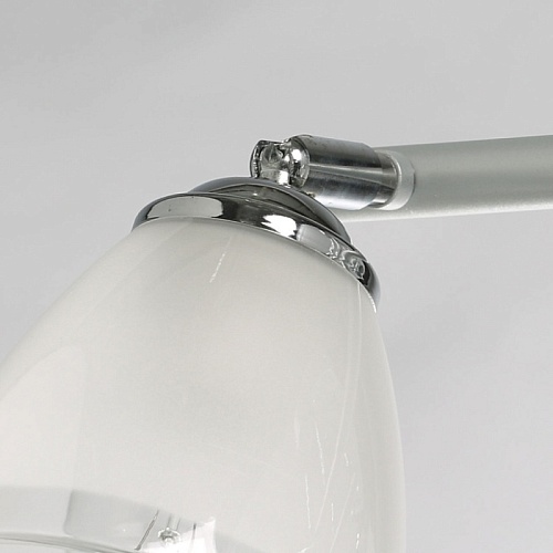Металлическое основание светильника окрашено в серый цвет. Отдельные элементы основания гальванизированы в цвет хрома. Светильник декорирован матовыми стеклянными плафонами с прозрачной каймой по нижнему краю.