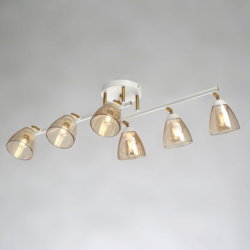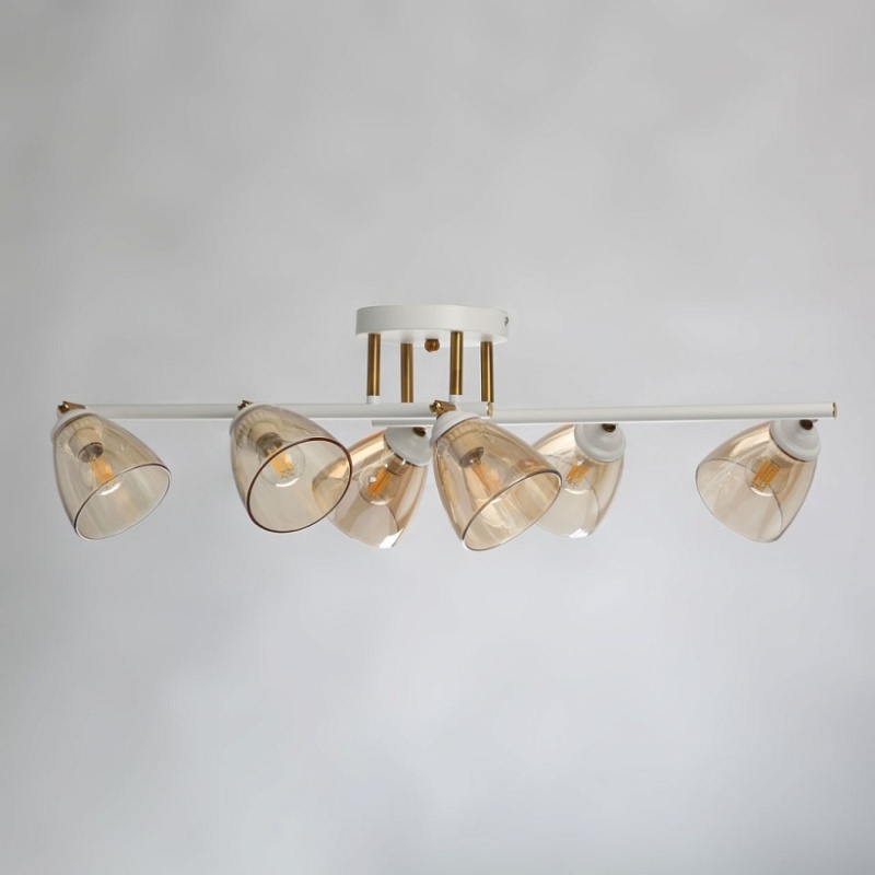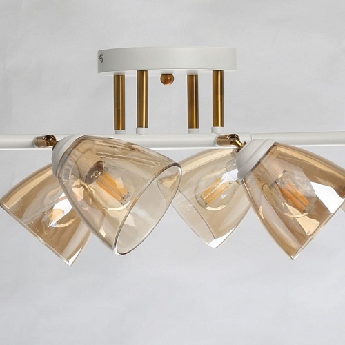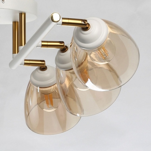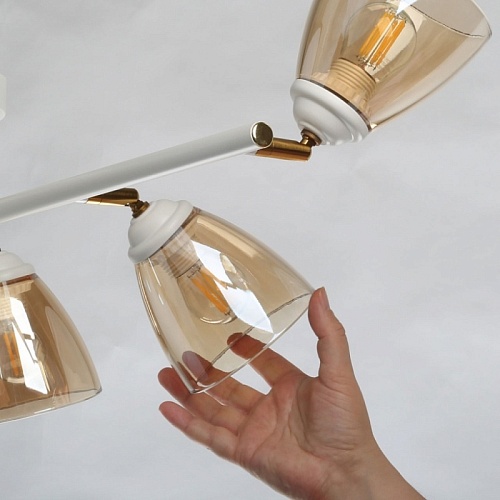 Металлическое основание потолочного светильника окрашено в белый цвет. Отдельные элементы гальванизированы в цвет матовой бронзы. Стеклянные плафоны гальванизированы в цвет шампань.