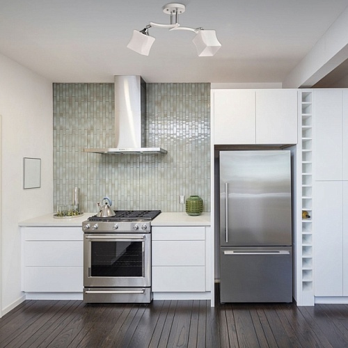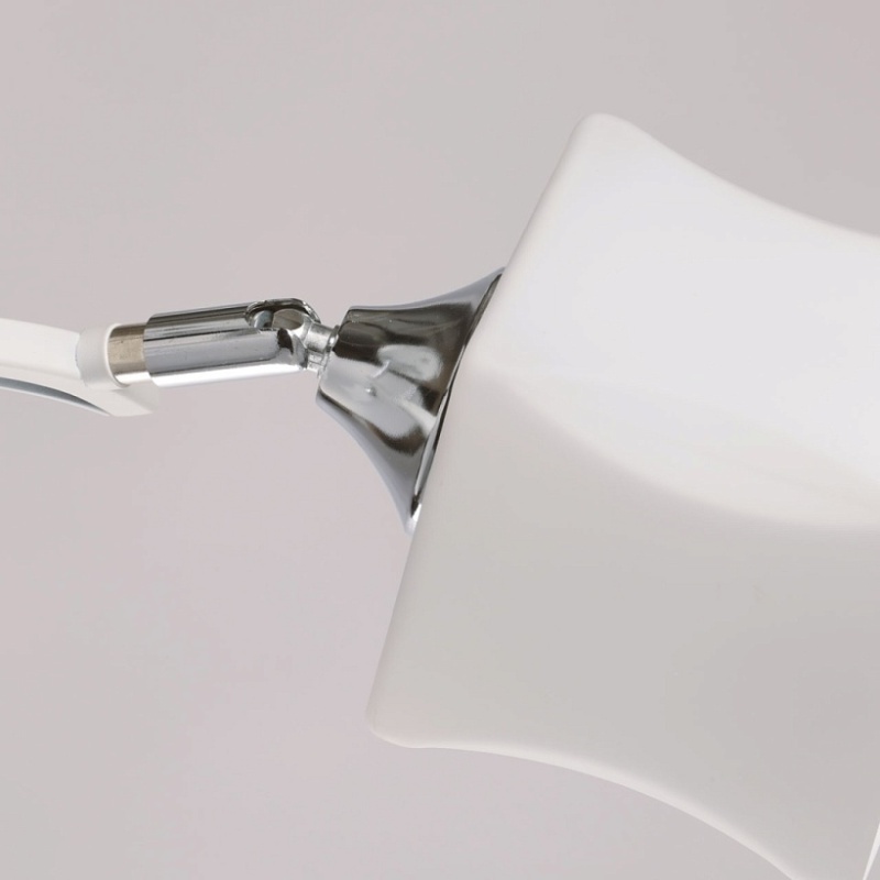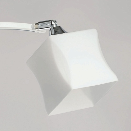 Металлическое основание потолочной люстры окрашено в белый цвет. Отдельные элементы основания гальванизированы в цвет хрома. Стеклянные плафоны отлиты в оригинальную форму и окрашены в белый цвет с внутренней стороны.