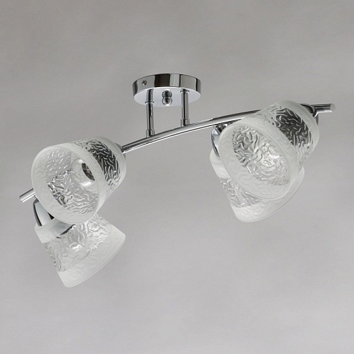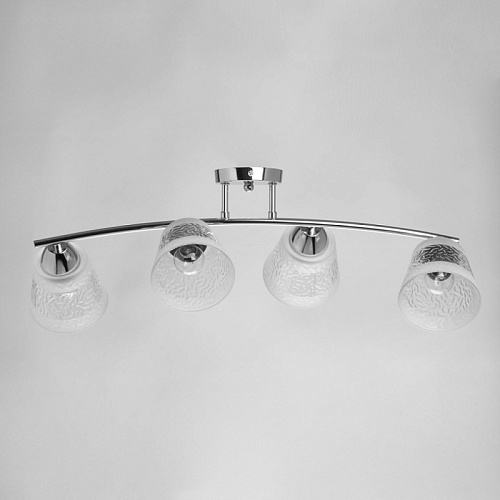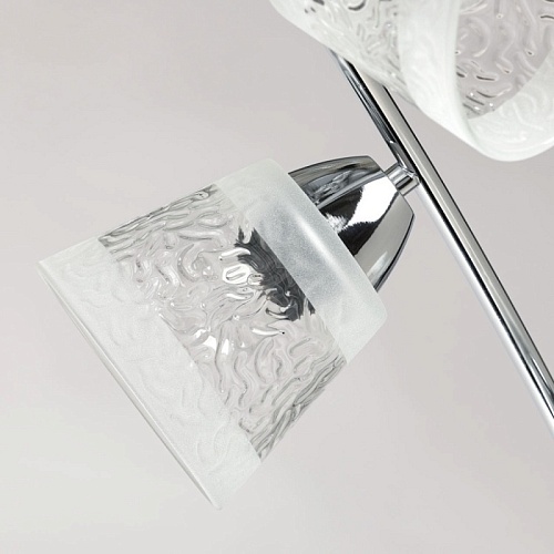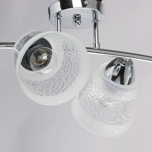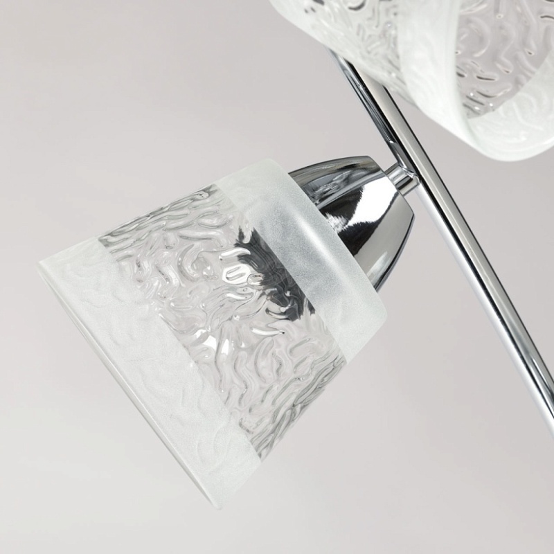 Металлическое основание потолочной люстры гальванизировано в цвет хрома. Стеклянные фактурные плафоны матированы по трафарету.