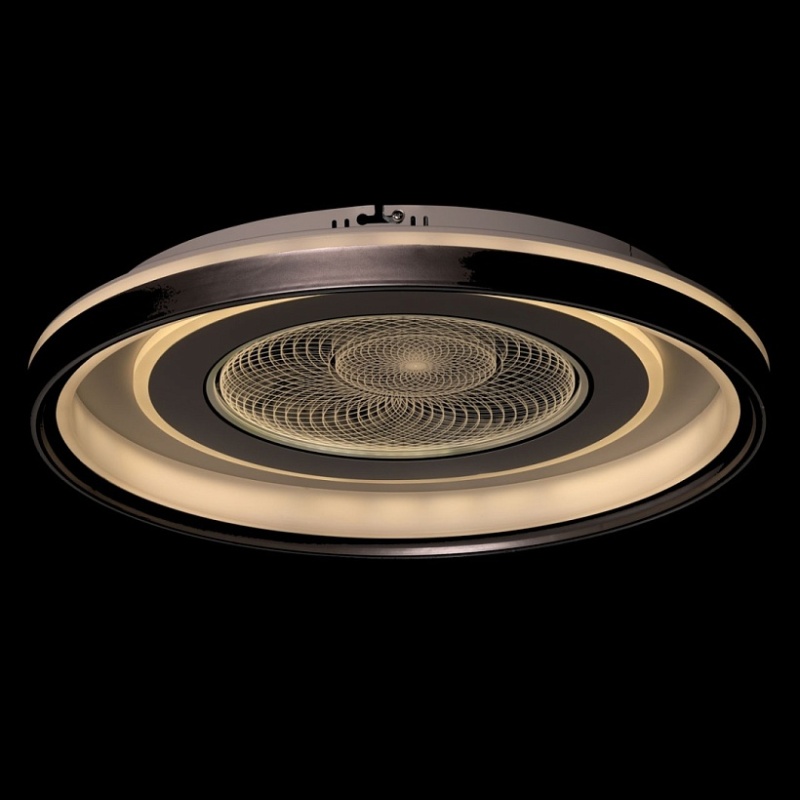 Металлическое основание потолочной люстры окрашено в белый цвет. Корпус плафона выполнен из сплава алюминия с цинком и окрашен в серый и белый цвета. Светодиодные источники света закрыты прозрачным акрилом с 3D-эффектом. Светодиоды по периметру плафона закрыты белым матовым силиконом.