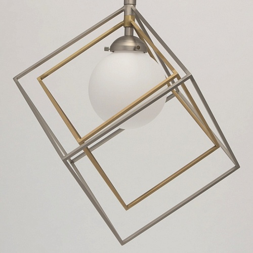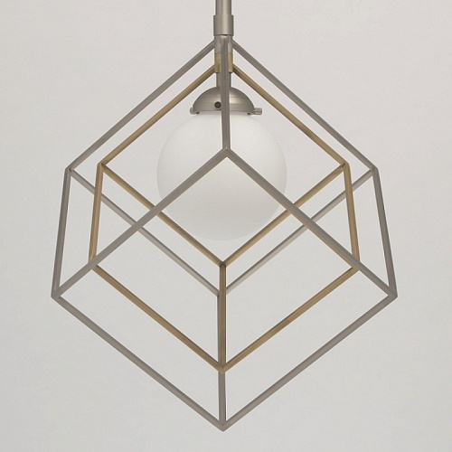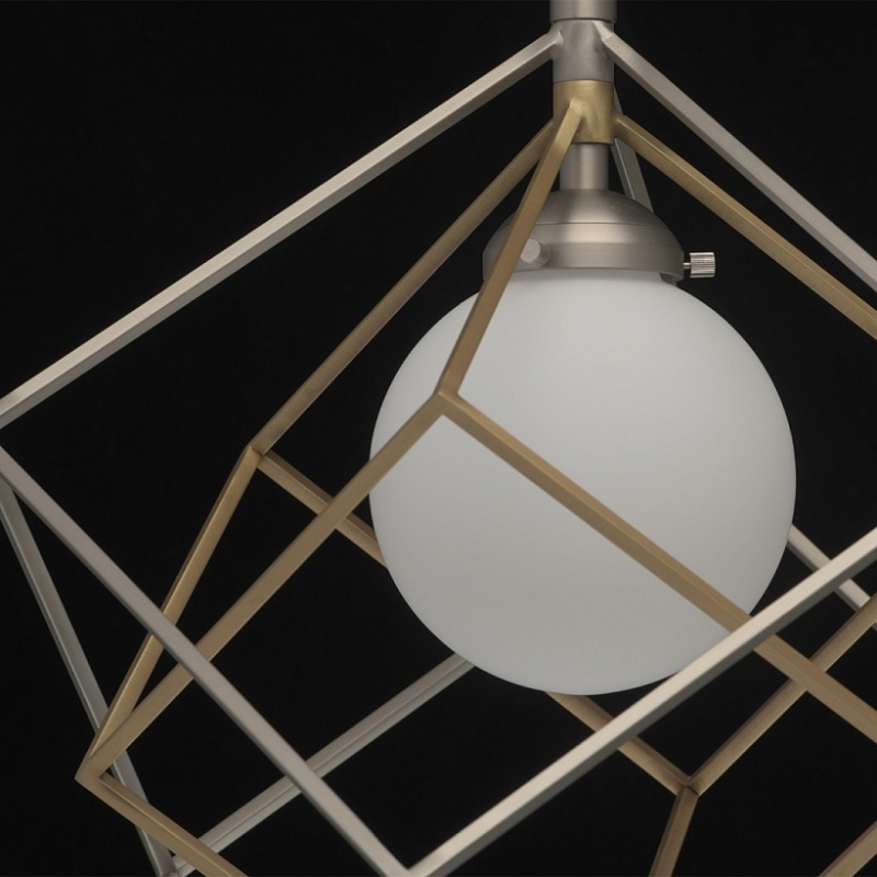 Основание выполнено из металла и гальванизировано в цвет матового никеля. Внутренний геометричный декоративный гальванизирован в цвет матовой бронзы. Плафон из стекла, отлитого в форму шара; изнутри окрашен в белый цвет, внешняя поверхность плафона матирована. Светодиодный источник света типа COB.