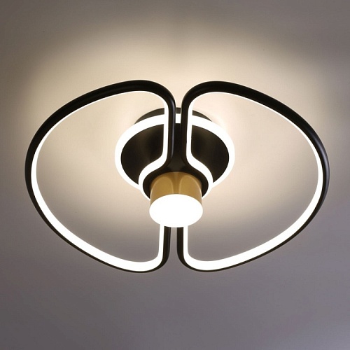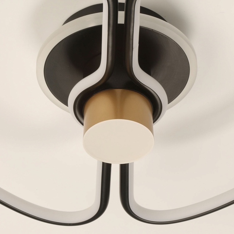 Металлическое основание потолочного светильника и плафон из сплава алюминия окрашены в черный цвет. Металлический элемент в центре гальванизирован в цвет золота. Светодиодный источник света закрыт белым матовым силиконом.