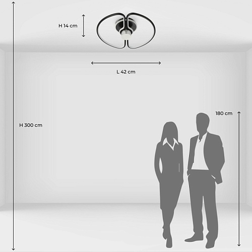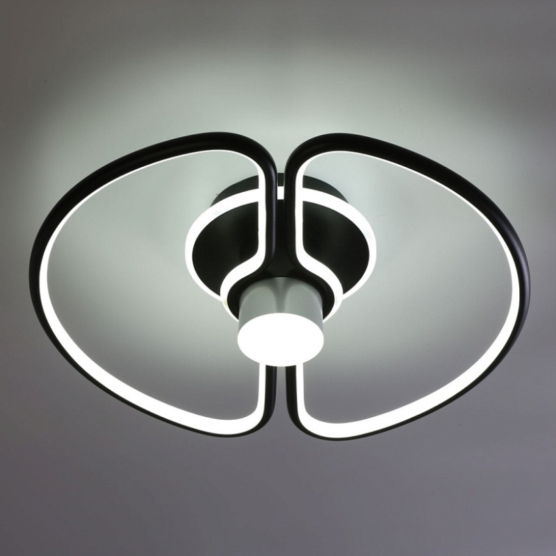 Металлическое основание потолочного светильника и плафон из сплава алюминия окрашены в черный цвет. Металлический элемент в центре гальванизирован в цвет серебра. Светодиодный источник света закрыт белым матовым силиконом.