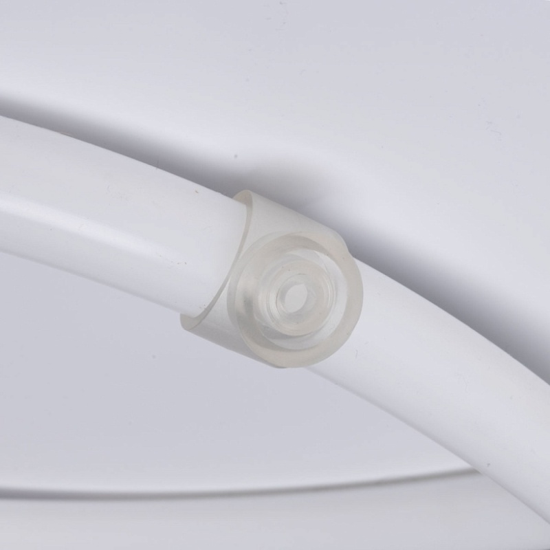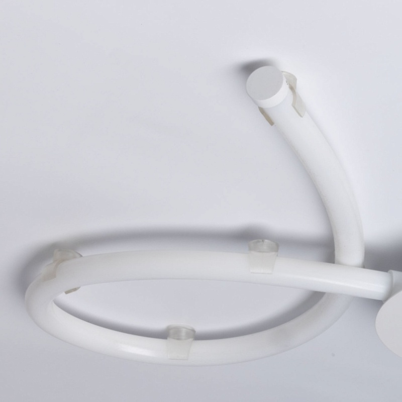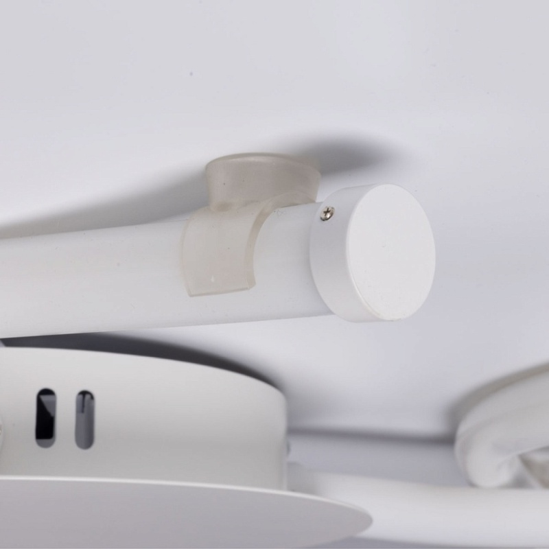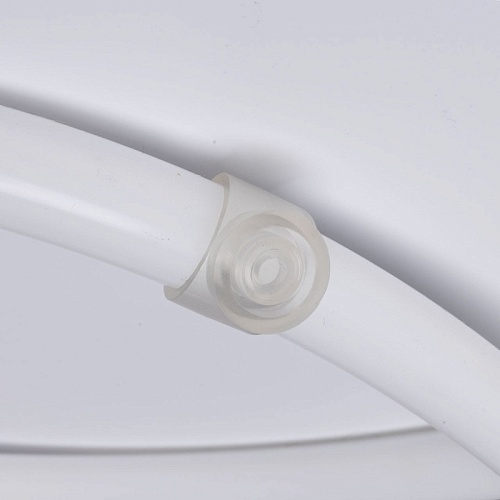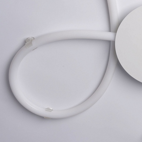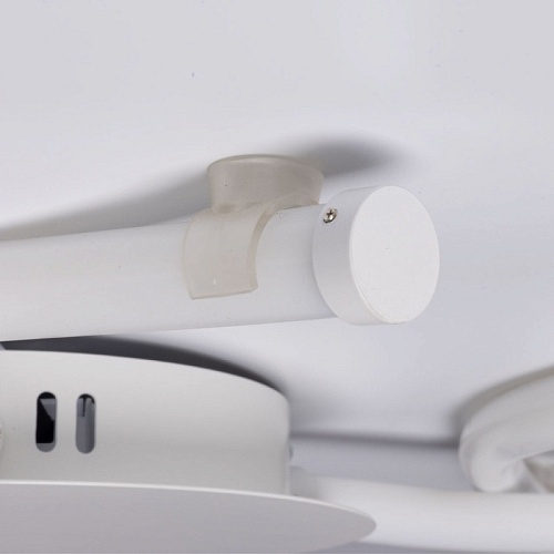 Металлическое основание потолочной люстры окрашено в белый цвет. Светодиодные источники света закрыты белым силиконом.