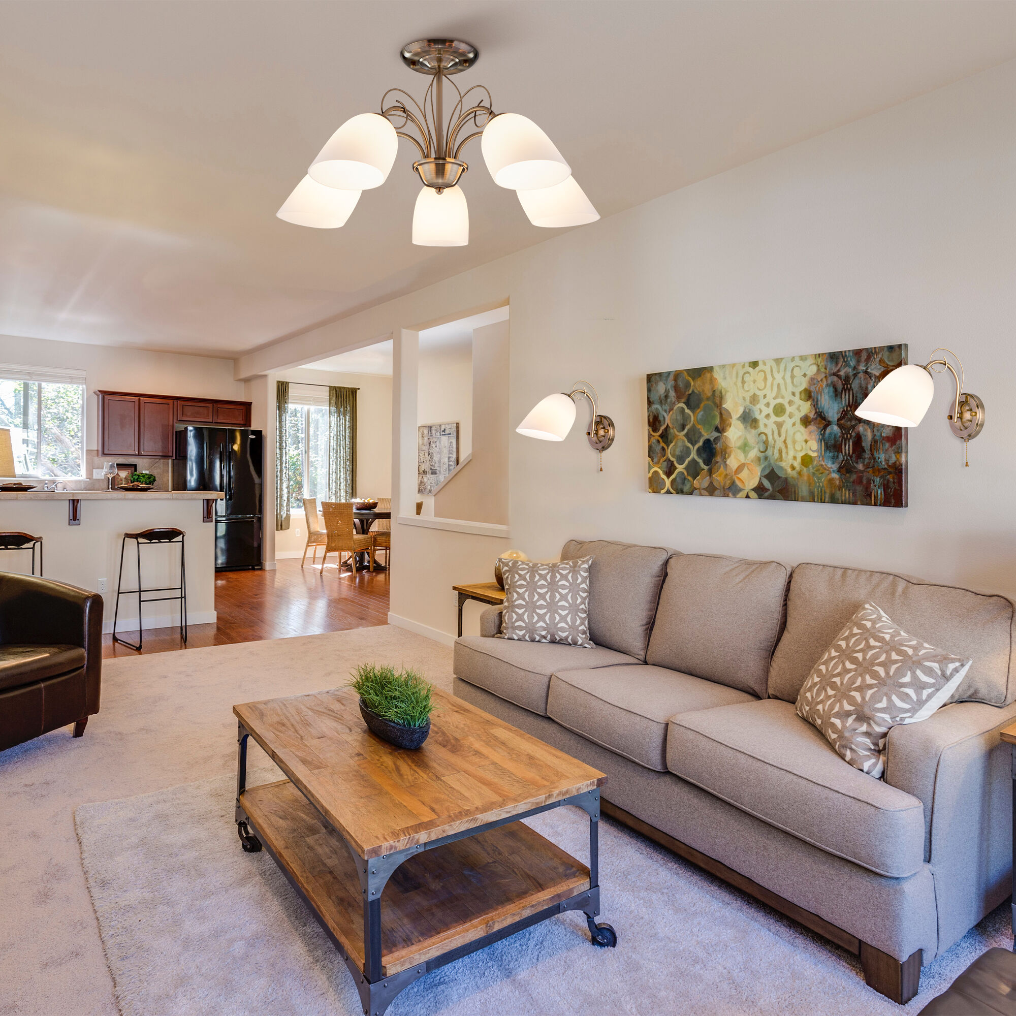 • Важный фактор для потолочных ламп и люстр – направление рассеивания света. Есть различные варианты и направления. В сторону, вверх или вниз, на пол. Если вы выбрали направление «вверх», следует рассмотреть более мощную лампу, так как освещение будет происходить при помощи отраженного от потолка света.