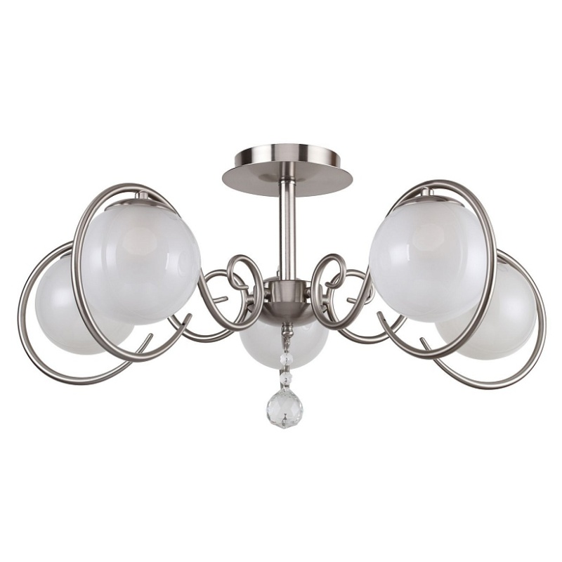 Металлический каркас цвета никель, плафоны из белого матового стекла, декор из прозрачного хрусталя.