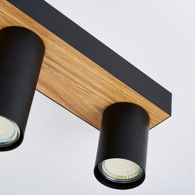 Металлический каркас черного цвета с декоративной вставкой из МДФ с фактурой дерева, черные матовые плафоны, лампа GU10 в комплект не входит.