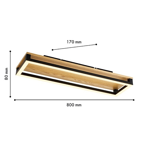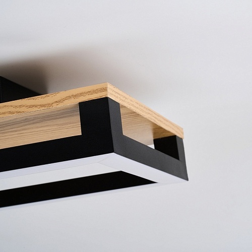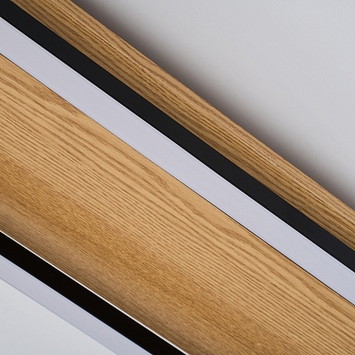 Металлический каркас черного цвета с декоративной вставкой из МДФ с фактурой дерева, встроенная LED лента с рассеивателем из белого непрозрачного пластика, регулируемая мощность и температуру света, пульт управления в комплекте.