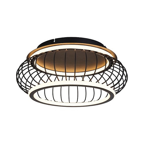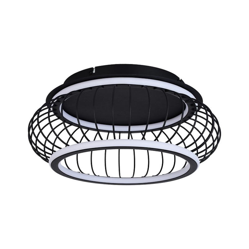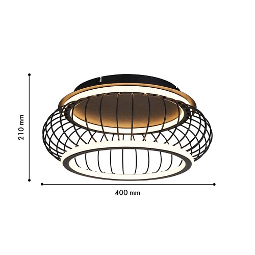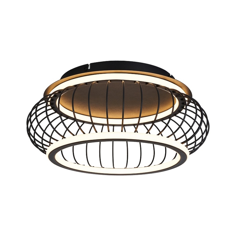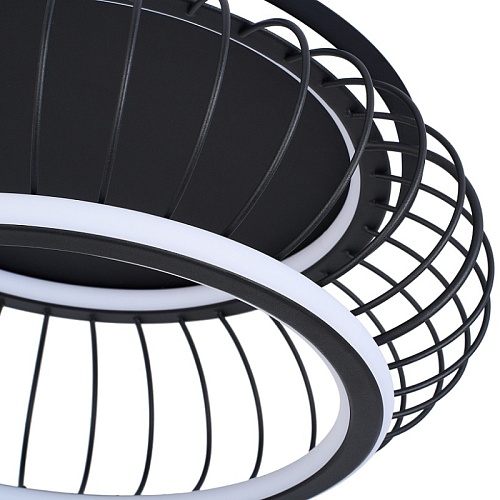 Плафон из черных матовых металлических прутиков, образующих решетку, два световых элемента LED в форме колец с рассеивателем из белого пластика, регулируемые мощность и температуру света, пульт управления в комплекте.