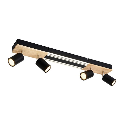 Металлический каркас черного цвета, декоративная вставка из МДФ с фактурой дерева на основании светильника, матовый черный каркас, встроенный LED-модуль, поворотные споты черного цвета.