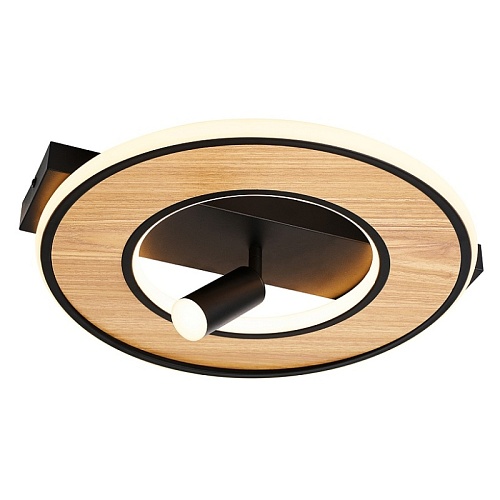 Металлический каркас черного цвета, декоративная вставка из МДФ с фактурой дерева на основании светильника, поворотный спот черного цвета, встроенный источник света по периметру кольца и внутри плафона, регулируемая мощность и температуру света, пульт в комплекте.