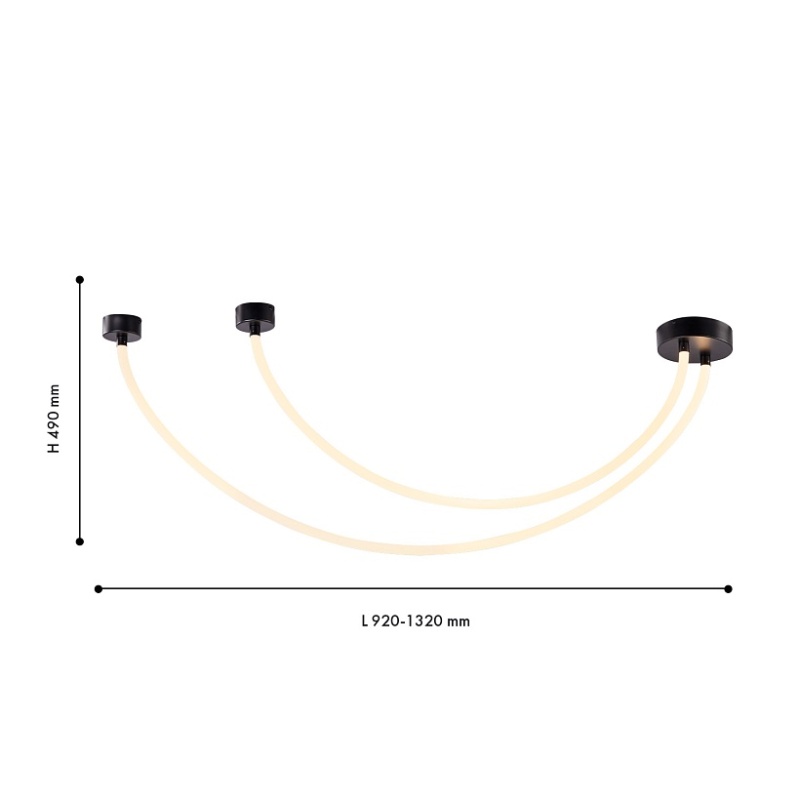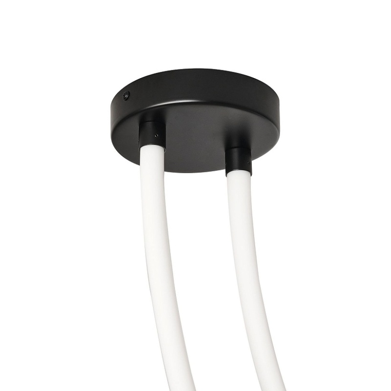 потолочный светильник, потолочное крепление из металла черного цвета, из которого выходят две длинные гибкие силиконовые трубки, выполняющие роль светового элемента, благодаря встроенному в них источнику LED. Меняя точки креплений на концах трубок можно создавать различные вариации светильника.