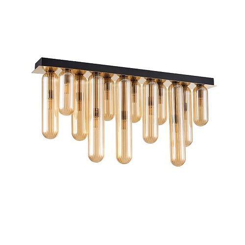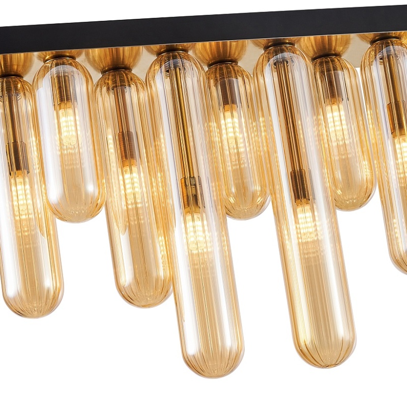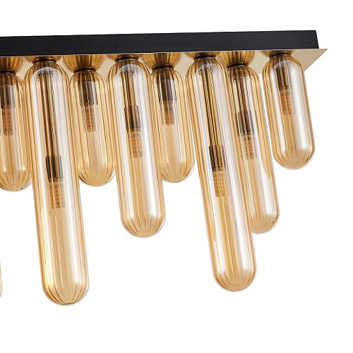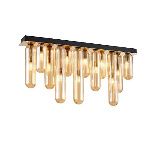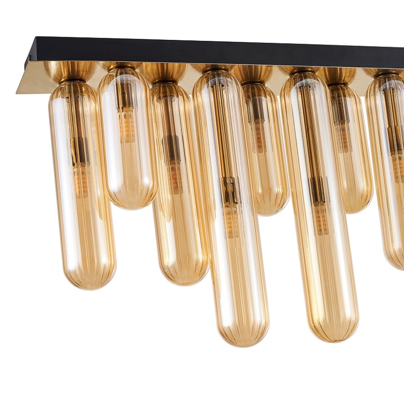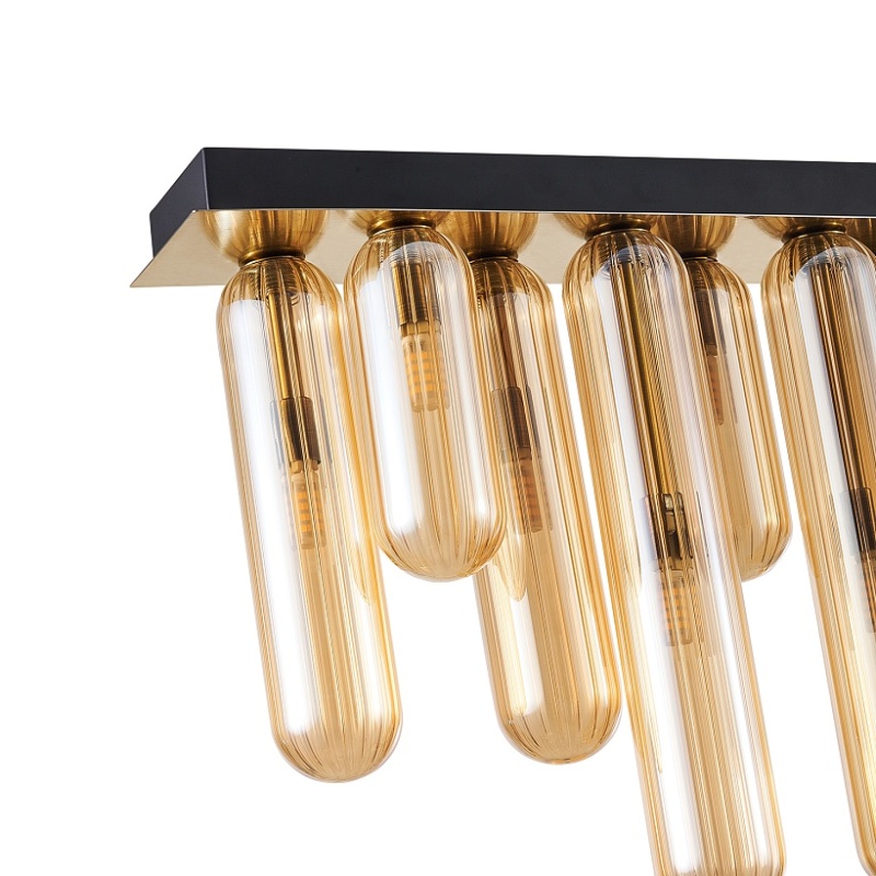 Светильник в виде прямоугольной черной платформы с удлиненными плафонами разной высоты, каркас из металла в цвете латунь, стеклянные плафоны янтарного цвета, сменная лампа G9.