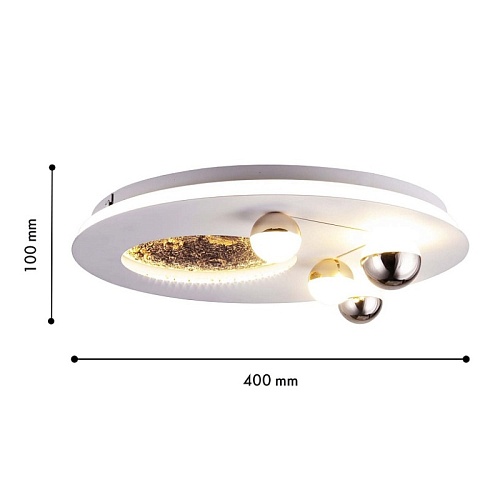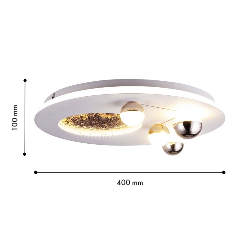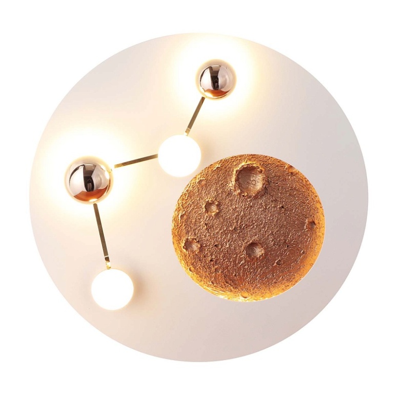 Возможность крепления на потолок или на стену, декоративное покрытие из акрила белого цвета, углубление с изображением луны со встроенной LED-лентой по периметру, плафоны в форме белых и золотых шариков, направляющих свет наружу и на Каркас светильника, встроенный LED-модуль.