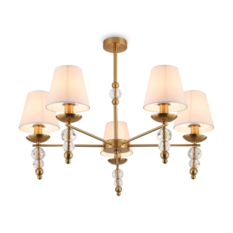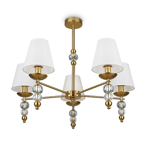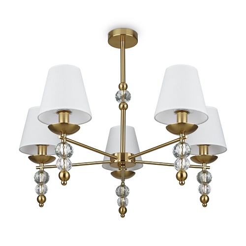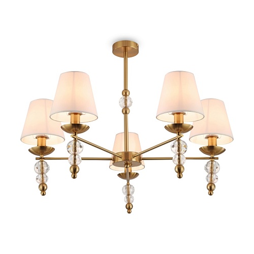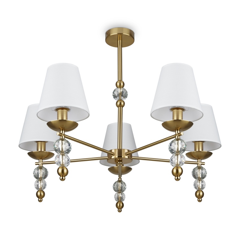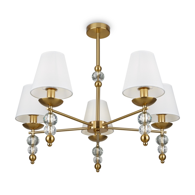 Материал абажура — ткань, цвет — белый. Металлическая арматура в цвете латунь обрамлена хрустальными бусинами. Источник света — лампы с цоколем Е14. Степень защиты — IP20.