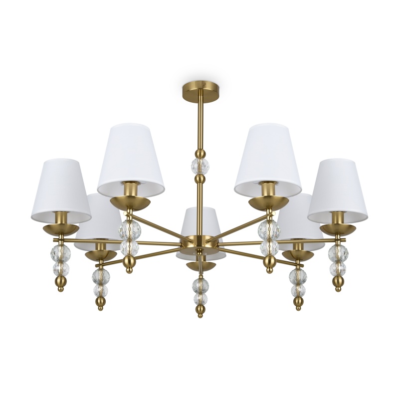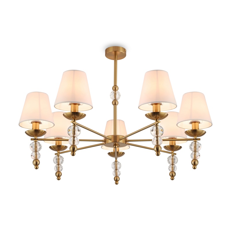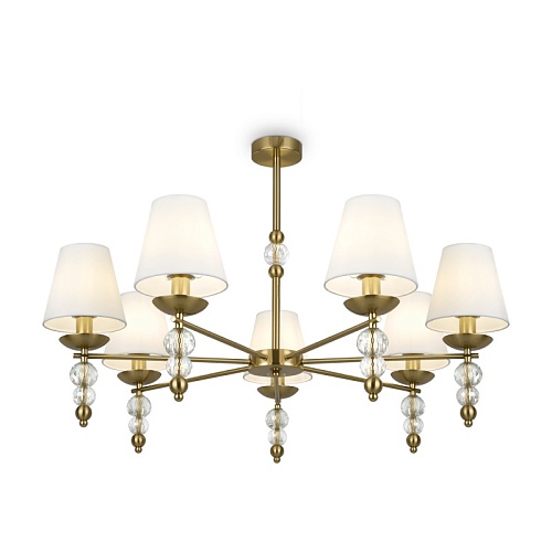 Материал абажура — ткань, цвет — белый. Металлическая арматура в цвете латунь обрамлена хрустальными бусинами. Источник света — лампы с цоколем Е14. Степень защиты — IP20.