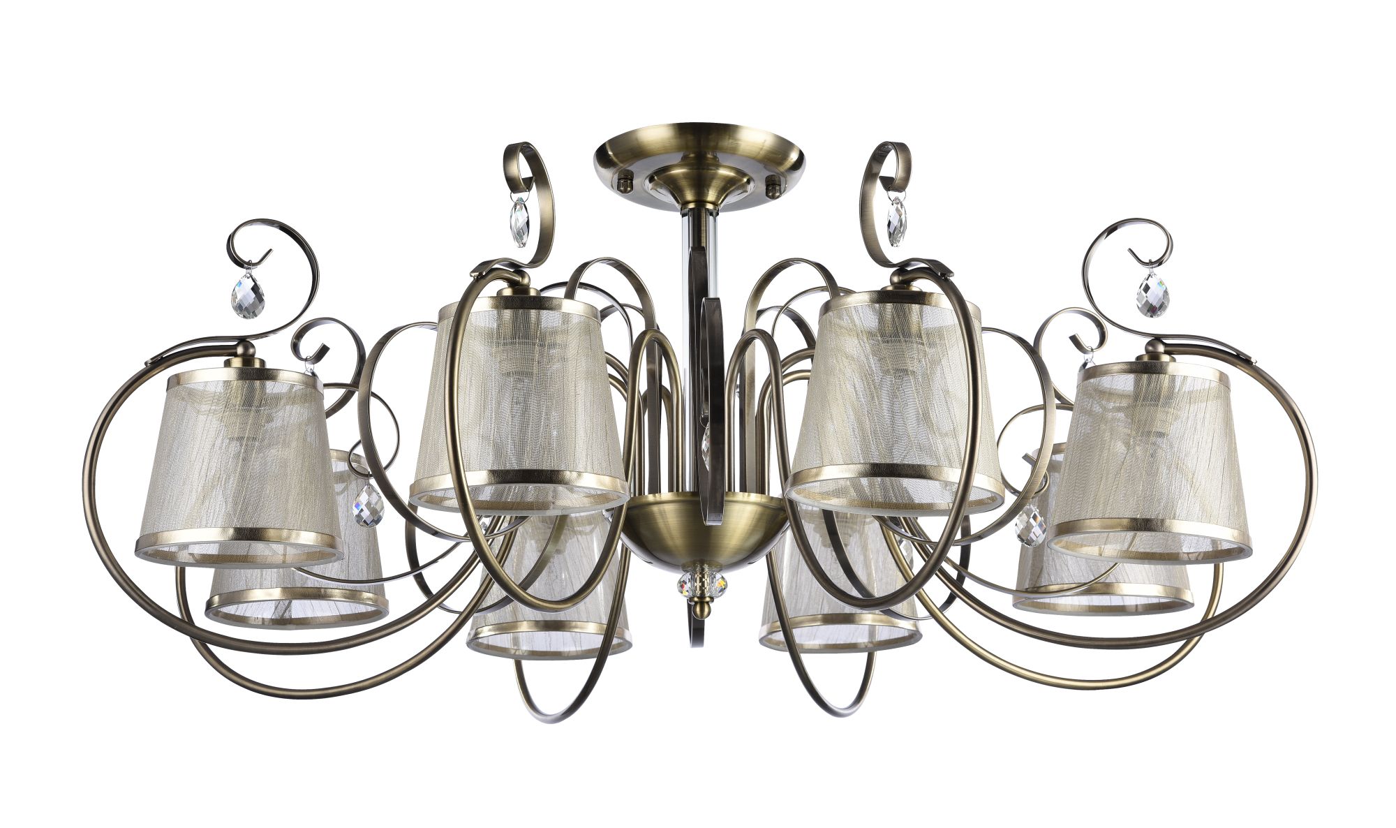 Абажуры и арматура светильников выполнены в разных цветах, с несколькими видами арматуры. Основание люстры украшено стеклянным декоративным элементом, а завитки рожков украшают подвески.