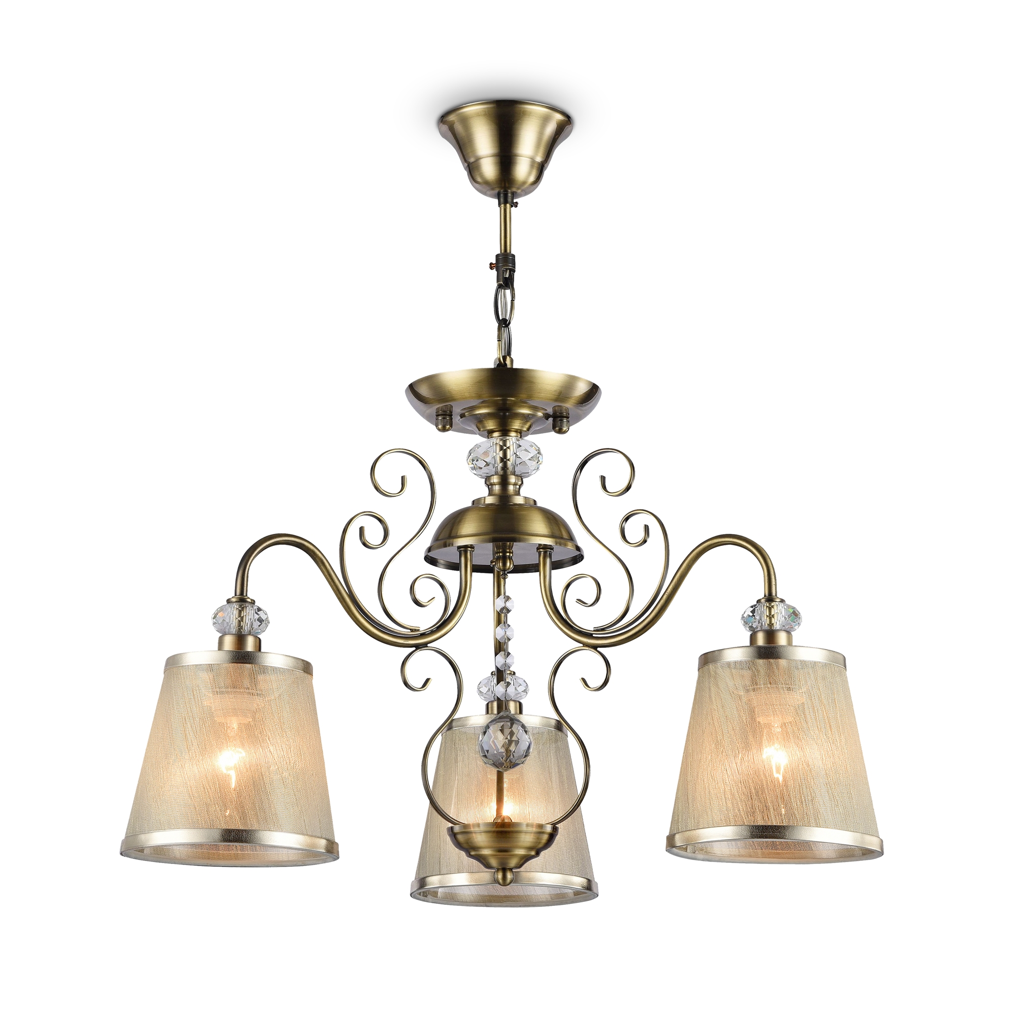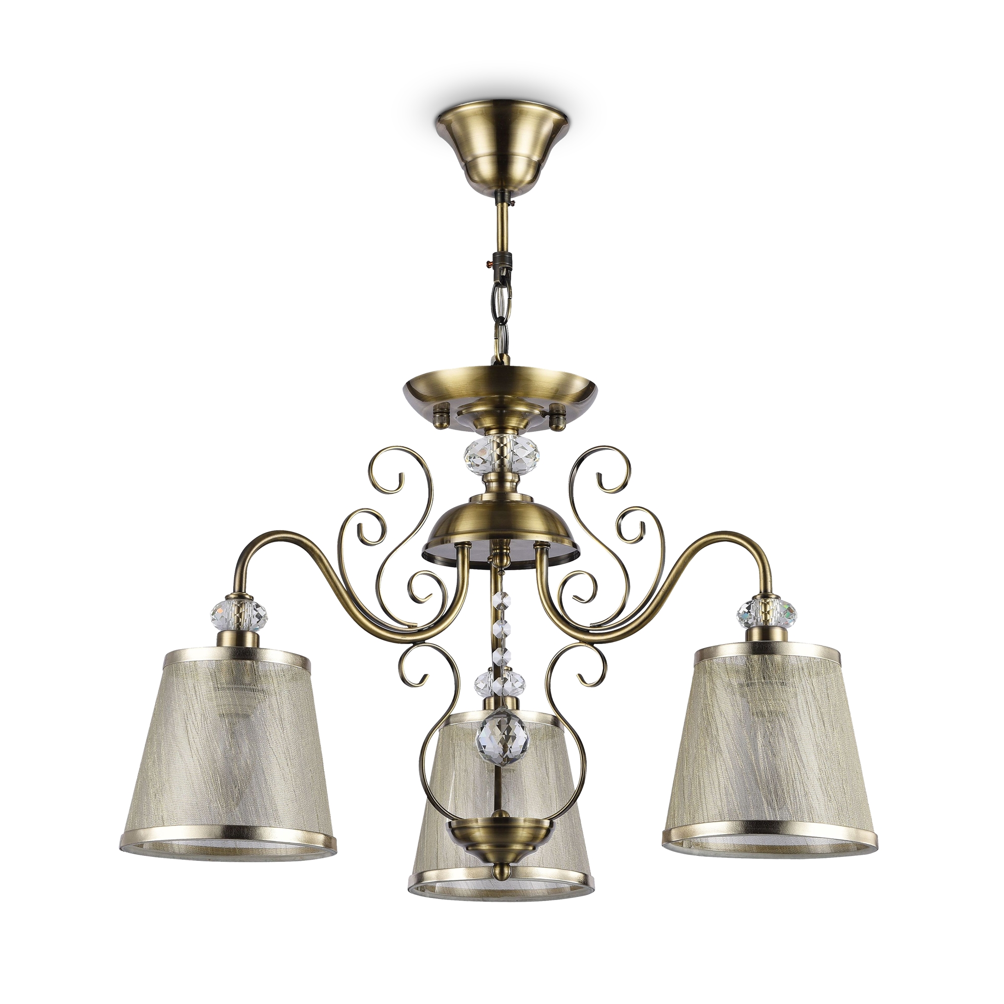 Серия из металла цвета античной бронзы. Арматура светильников Driana дополнены завитками на рожках и узогнутым декором в центральной части. Абажуры из полупрозрачной органзы выполнены в виде колокольчиков и обрамлены ободками из металла.