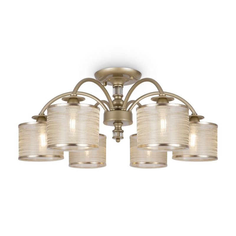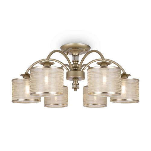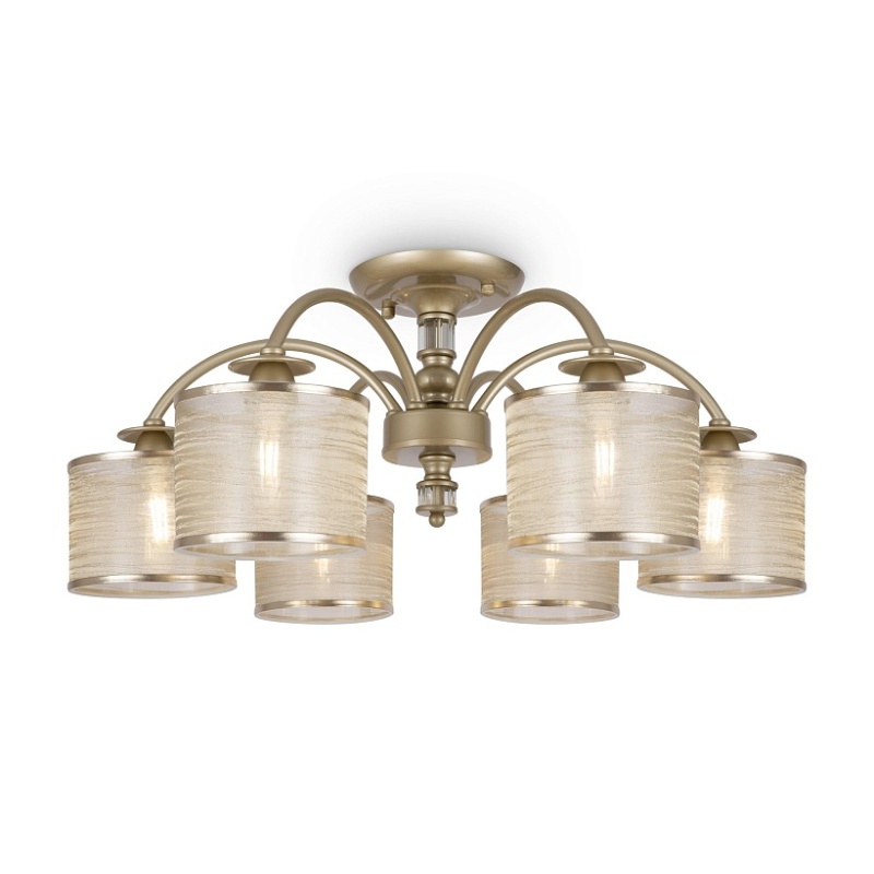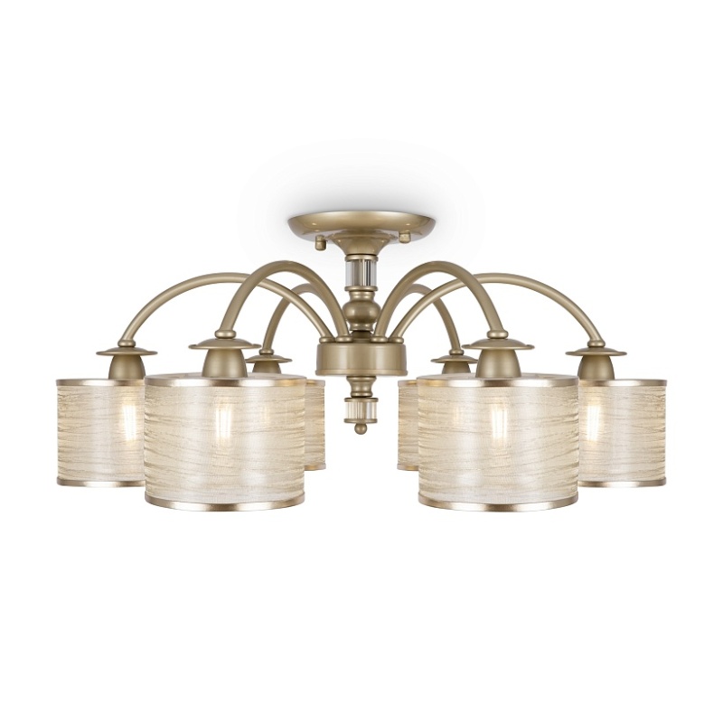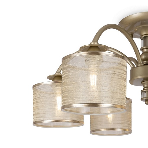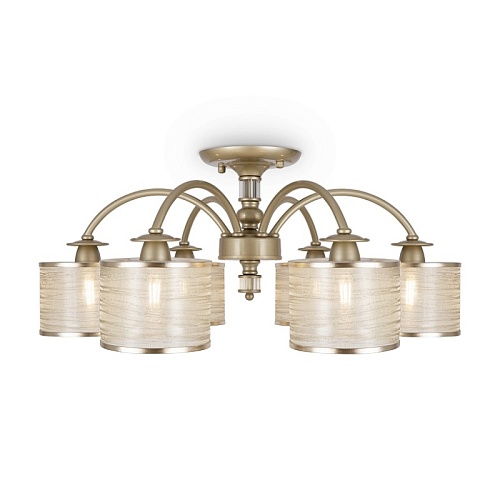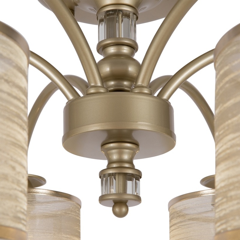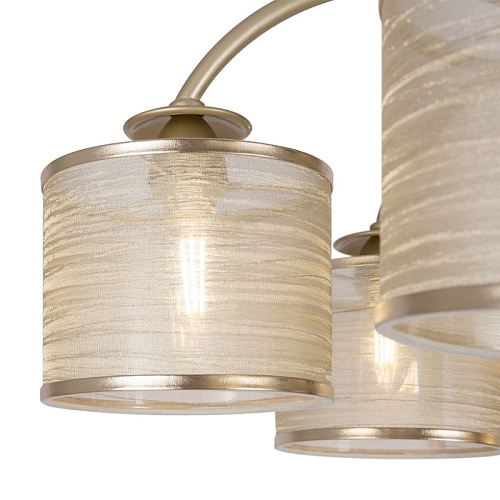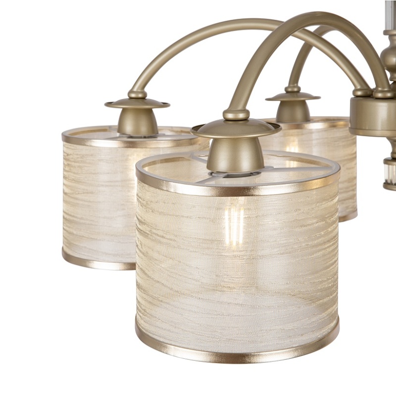 Арматура из металла в двух оттенках: матовое золото и латунь. Абажуры – текстиль на ПВХ бежевого оттенка. Часть абажуров в серии декорирована узорным кантом, часть – атласным кантом в тон арматуре. Торшер с цоколем Е27, лампа, бра и люстры – Е14.
