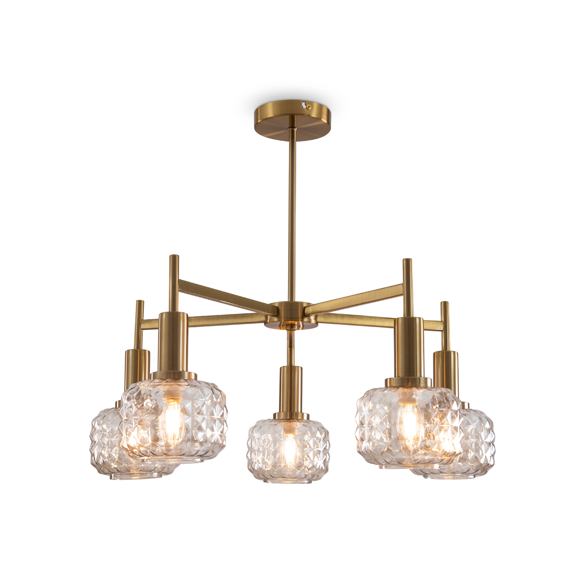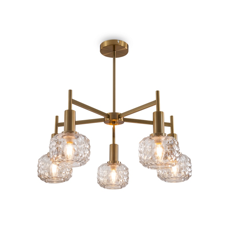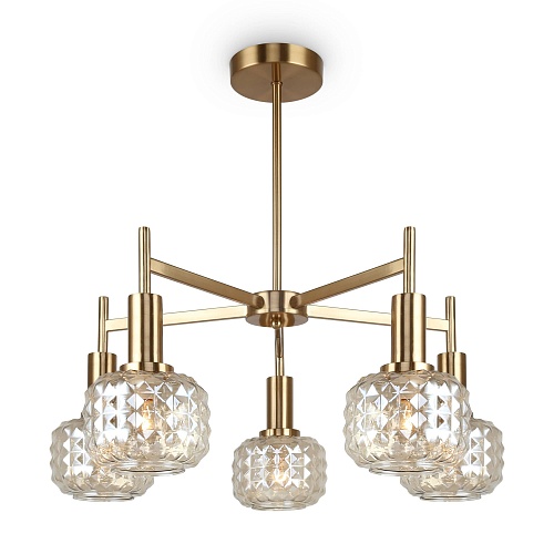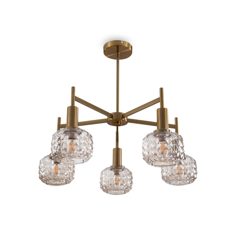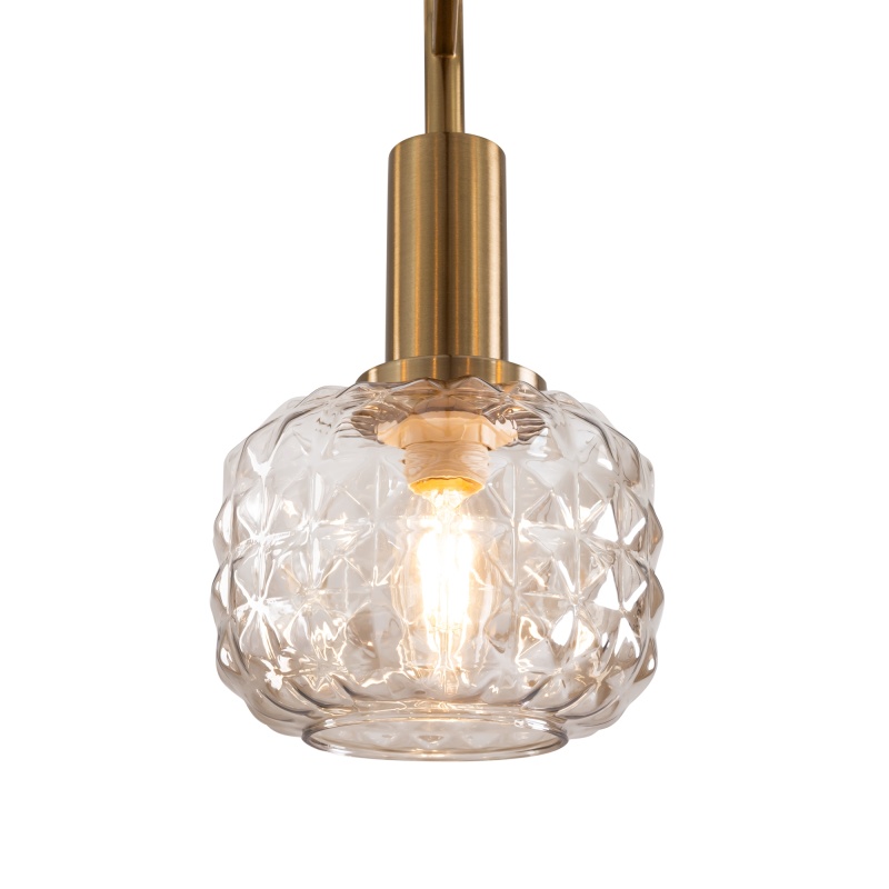 Металлическая арматура в цвете латунь. Плафоны из толстого рельефного стекла в оттенке амбра с «шипованной» огранкой. Подвесные модели регулируется по высоте. Источник света - лампа с цоколем Е14