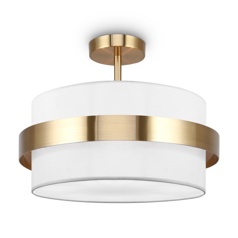 Цилиндрической формы абажур из ткани белого цвета. Декоративная парящая окантовка из металла в цвет арматуры. Регулируется по длине. Компактные размеры подходят для низких потолков и небольших интерьеров. Металлическая арматура, цвет - латунь и никель. Источник света — лампа с цоколем Е14, E27 и для настенного бра дополнительный LED с температурой свечения 3000 K.