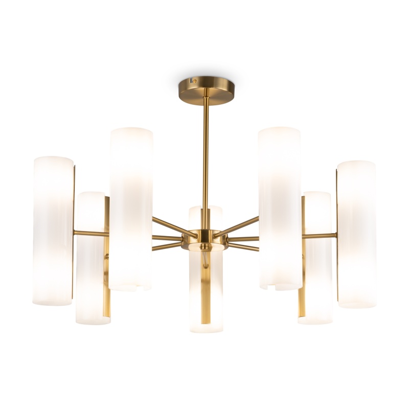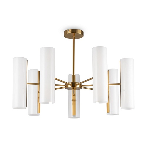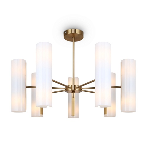 Арматура — металлическая, цвет — латунь. Стеклянные белые плафоны-цилиндры мягко рассеивают свет в стороны. Открытые края плафонов и глянцевая поверхность дают дополнительный свет в вверх и вниз для максимальной освещенности. Источник света — лампа с цоколем Е14.