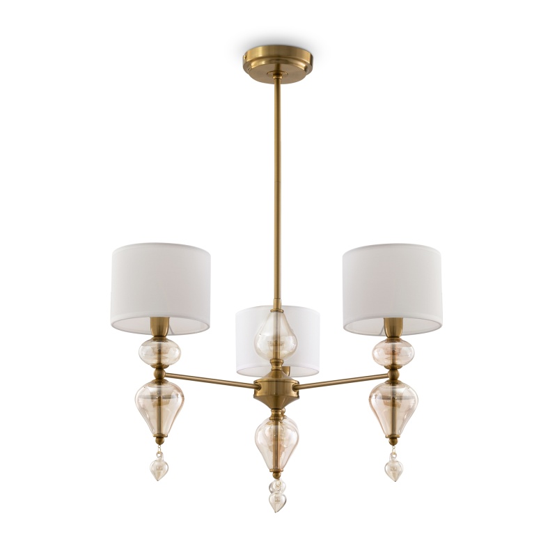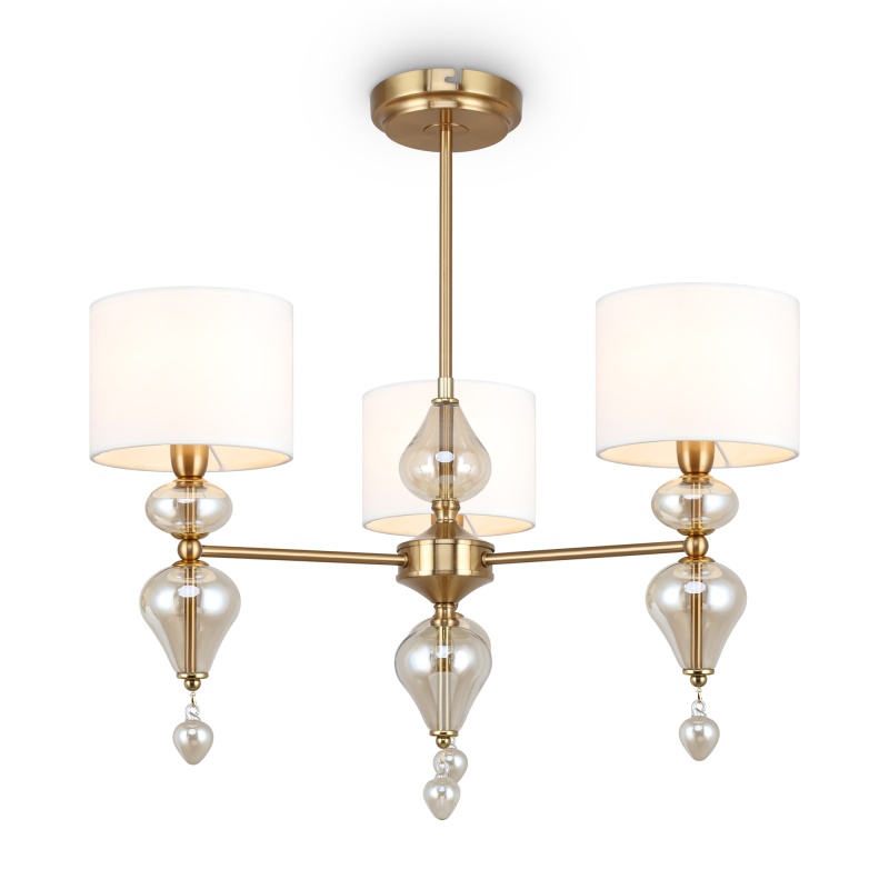 Арматура из металла, цвет — латунь. Плафоны — тканевые, молочного цвета. Металлическая конструкция декорирована выдувными стеклянными элементами с перламутровым напылением. Источником света служит лампа с цоколем Е14.